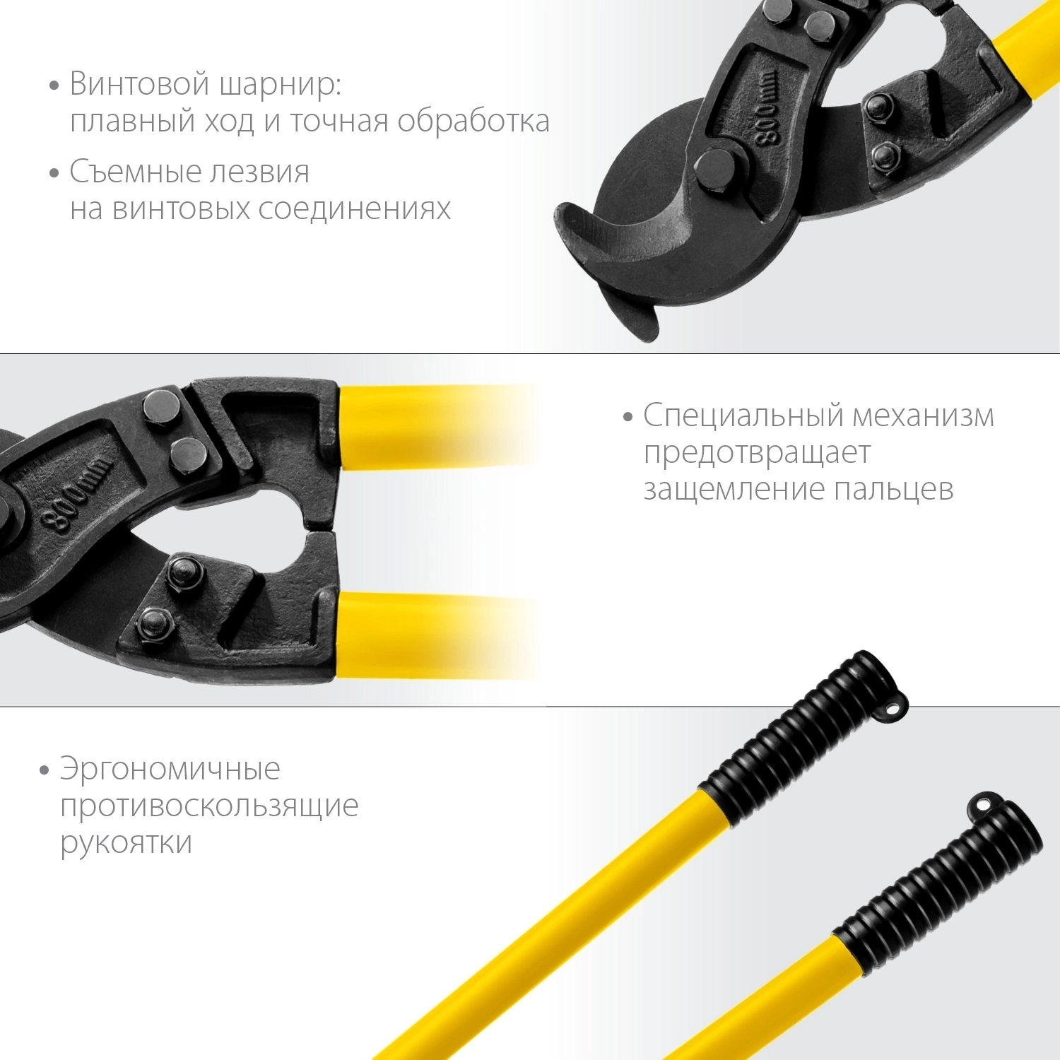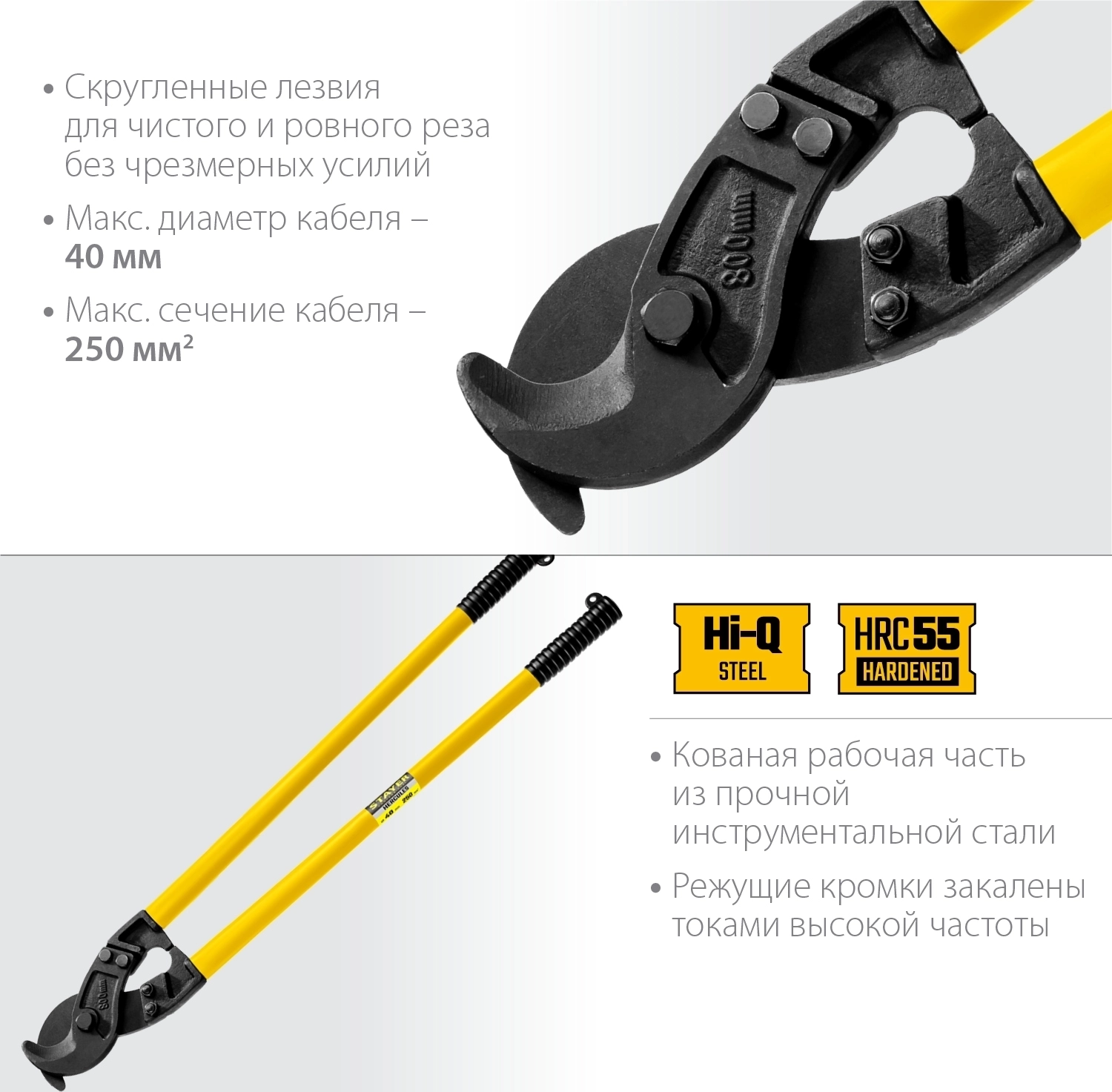 Кабелерезы STAYER изготовлены из высококачественной стали и предназначены для перекусывания неармированного одножильного или многожильного кабеля из цветных металлов (Cu + Al) без деформации и замятия краев. Максимальный диаметр кабеля 25мм.