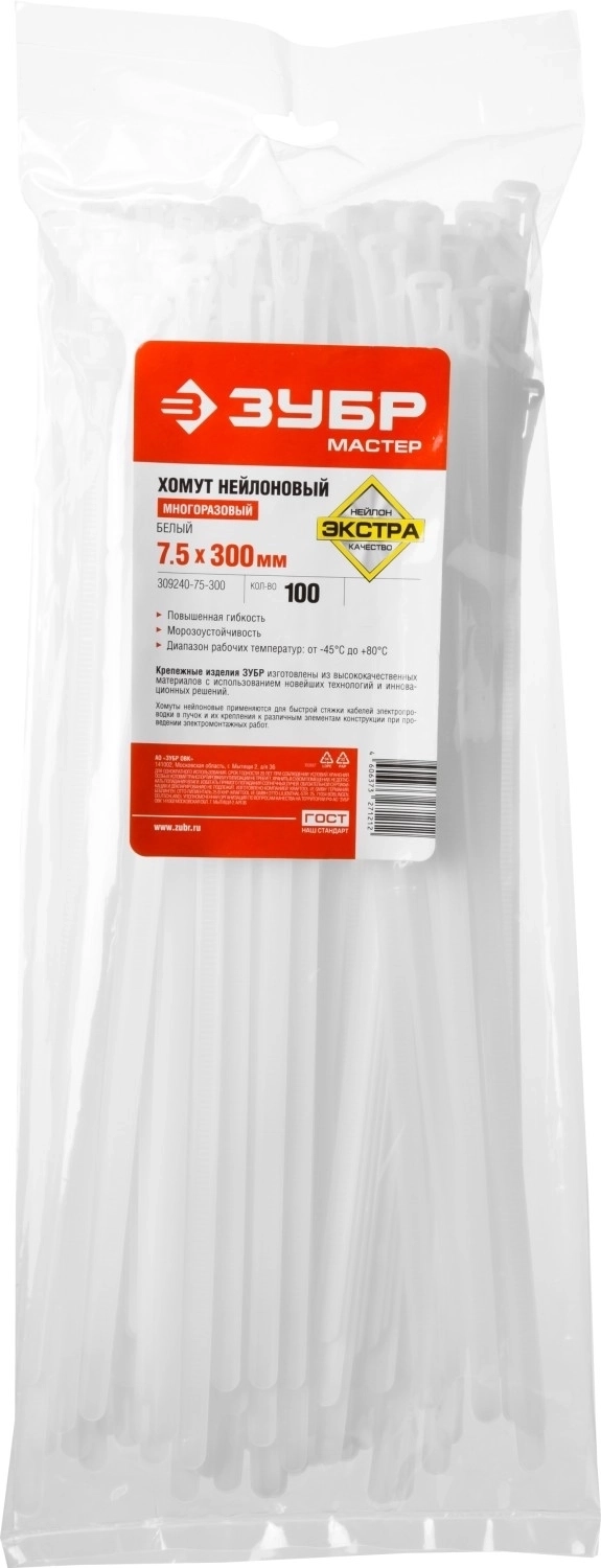 Кабельные стяжки разъемные ЗУБР КСР-Б1 7.5 x 300 мм нейлон РА66 100 шт белые