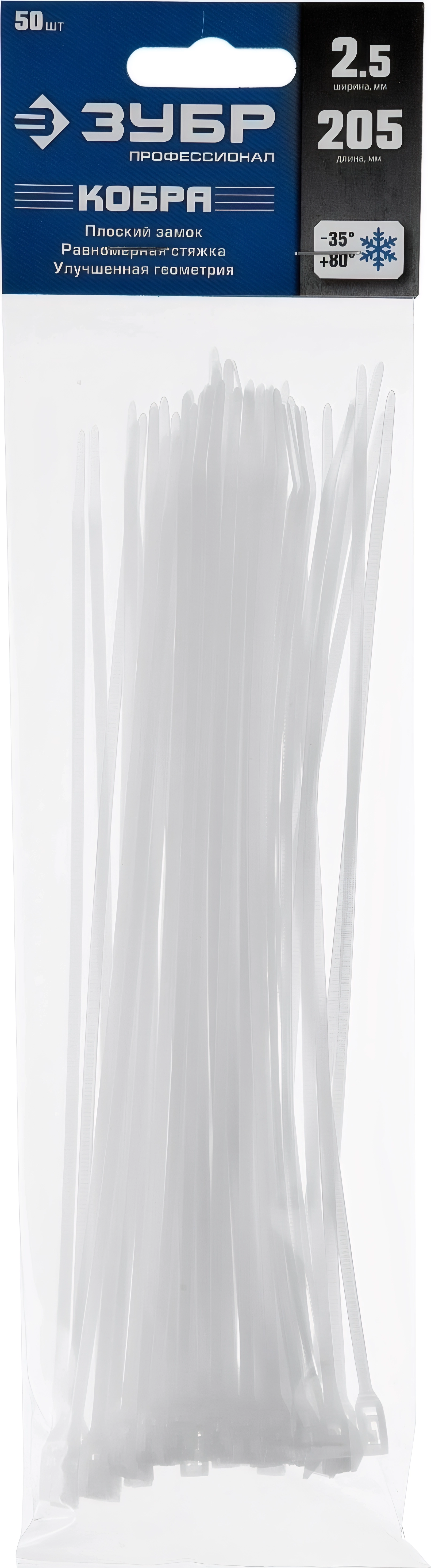 Кабельные стяжки с плоским замком ЗУБР КОБРА 2.5 x 205 мм нейлон РА66 50 шт белые