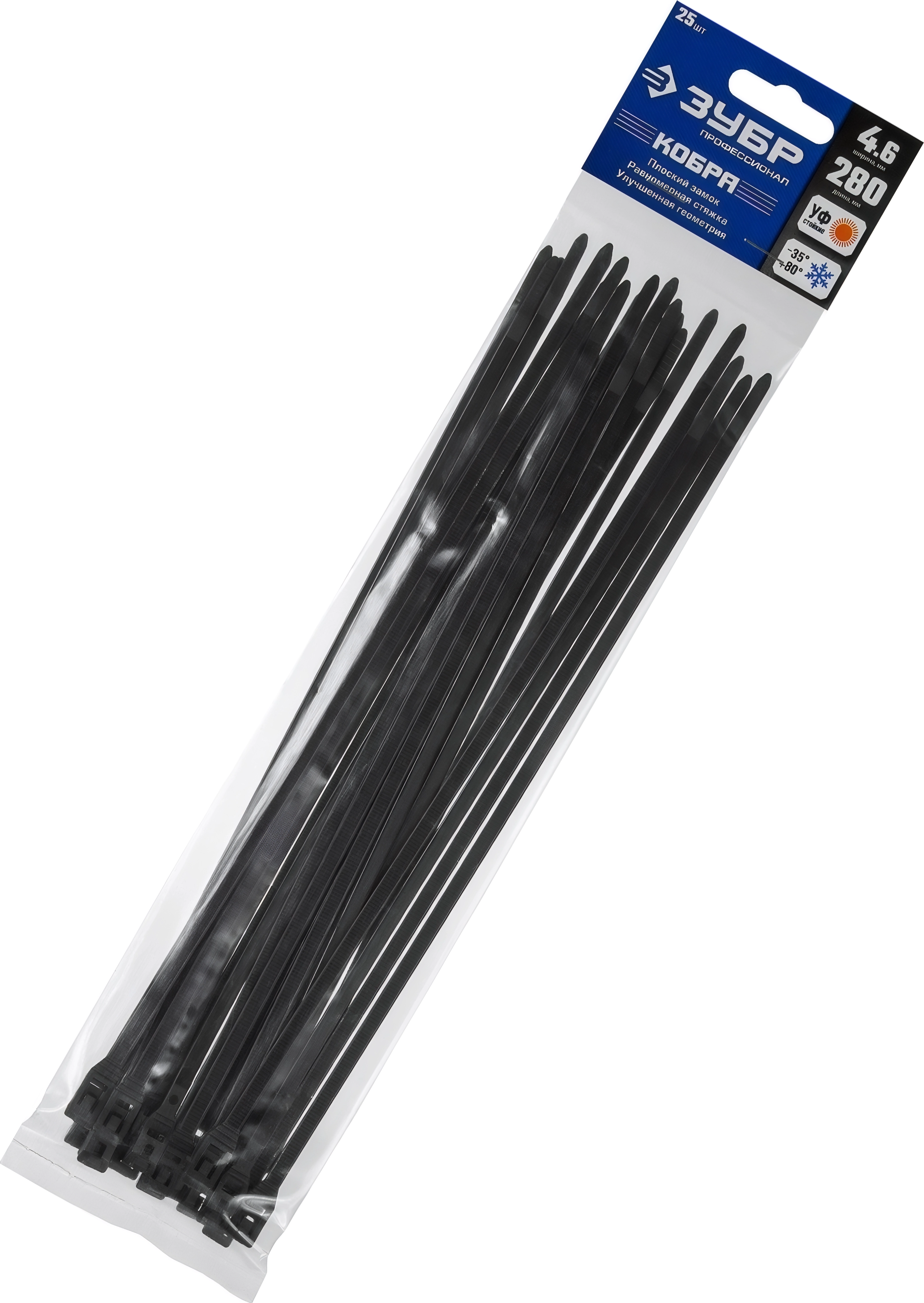 Кабельные стяжки с плоским замком ЗУБР КОБРА 4.6 x 280 мм нейлон РА66 25 шт черные