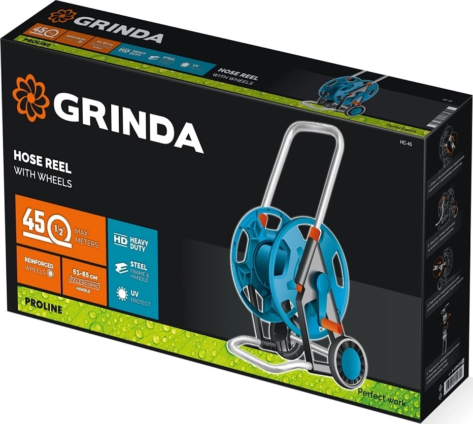 Катушка для шлангов ProLine GRINDA HC-45, для 45м x 1/2″ и 20м х 3/4″, усиленные колёса, телескопическая ручка
