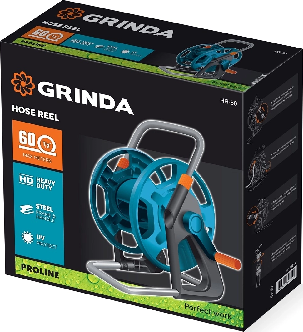 Катушка для шлангов ProLine GRINDA HR-60, для 60м x 1/2″ и 30м х 3/4″, стальные опоры, пластиковый барабан