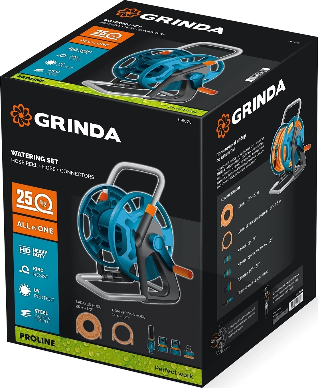 Катушка со шлангом в комплекте ProLine GRINDA HRK-25, шланг 25м x 1/2″, поливочный набор 4 предмета, стальные опоры