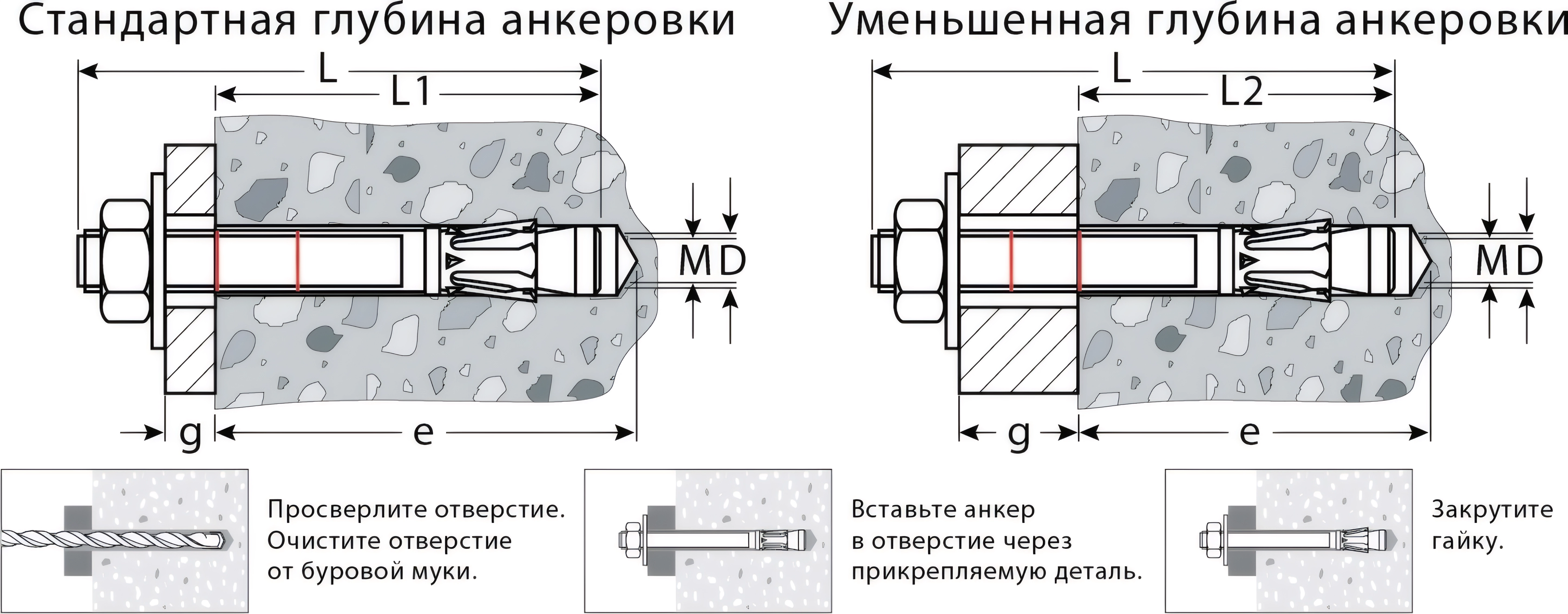 Для крепления различных конструкций к поверхностям из бетона и природного камня. Анкер устанавливается в предварительно просверленное и очищенное от буровой муки отверстие и расклинивается при закручивании гайки