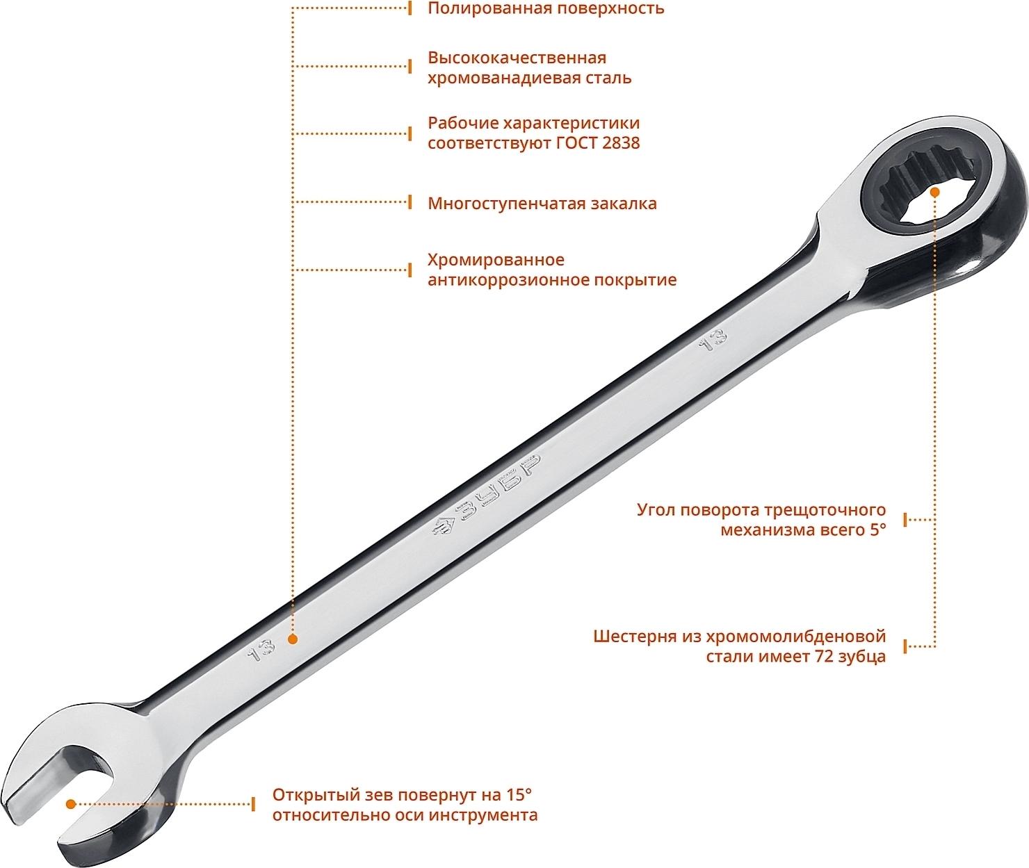 Комбинированный трещоточный гаечный ключ ЗУБР 13 мм