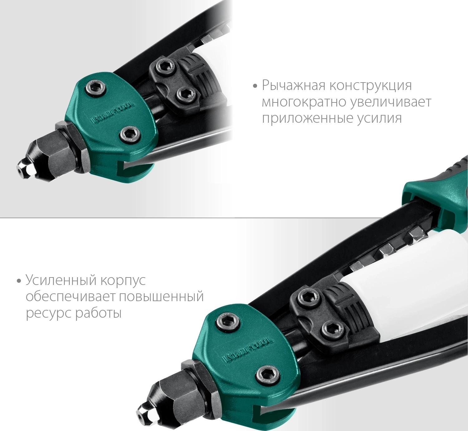 - Компактный размер, контейнер для отработанных заклепок и двухкомпонентные рукоятки повышают удобство использования