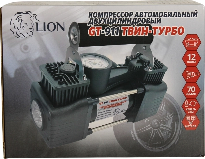 Компрессор 2-поршневой LION GT-911 70л/мин мет корпус, LED-фонарь, в сумке