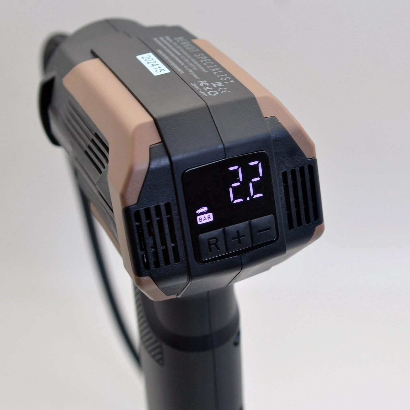 Предназначен для накачивания различных шин: легковых автомобилей, кроссоверов, лёгких внедорожников и пикапов, а также квадроциклов, мотоциклов, мопедов, велосипедов и другой колесной техники. Устройство оснащено точным цифровым манометром с четырьмя единицами измерения (PSI, бар, кПа, кг/см²) и функцией АВТОСТОП — автоматическая остановка по заданному пределу давления. Компрессор выделяется крупным LED-дисплеем и удобной логикой управления; многие режимы имеют предустановленные значения давления. Производительность — 45 л/мин, что обеспечивает скорость накачки, близкую к мощным автомобильным компрессорам. Съёмный аккумулятор заряжается через разъём Type-C за 2–3 часа.