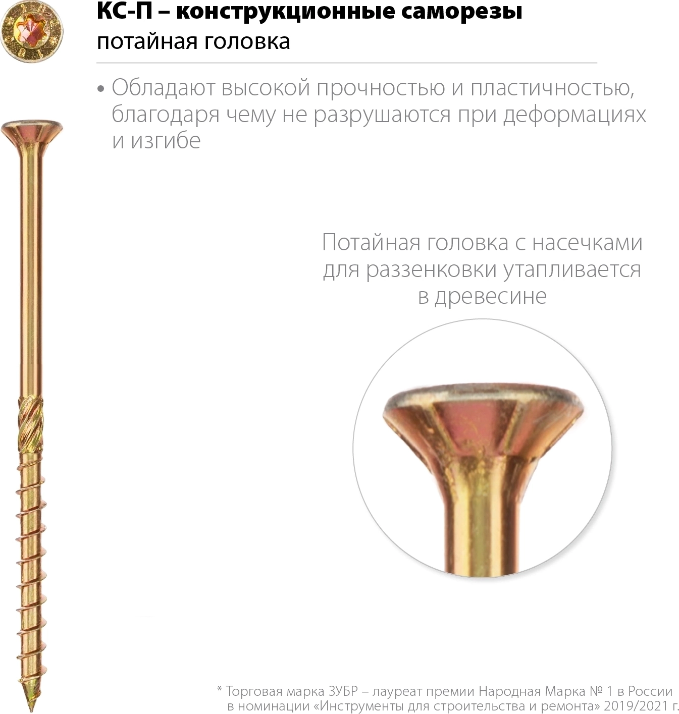 Конструкционные саморезы обладают высокой прочностью и пластичностью, благодаря чему не разрушаются при деформациях и изгибе. Режущая кромка на острие, точная геометрия резьбы и специальная фреза значительно облегчают вкручивание самореза и предотвращают растрескивание древесины.