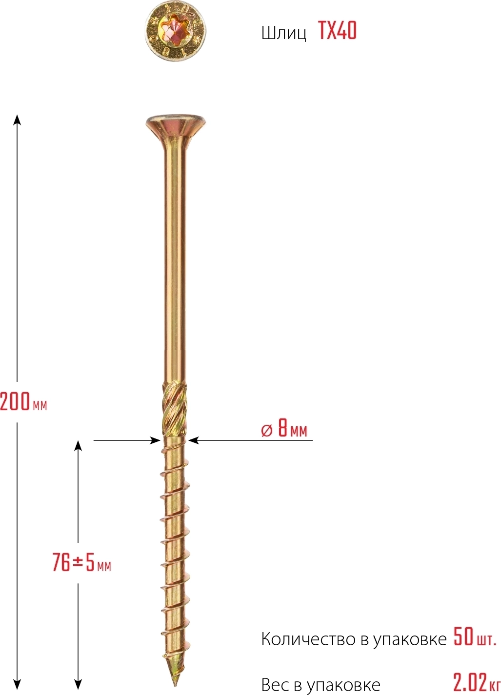 Конструкционный саморез ЗУБР КС-П 200 х 8.0 мм TX40 потайная головка желтый цинк 50 шт