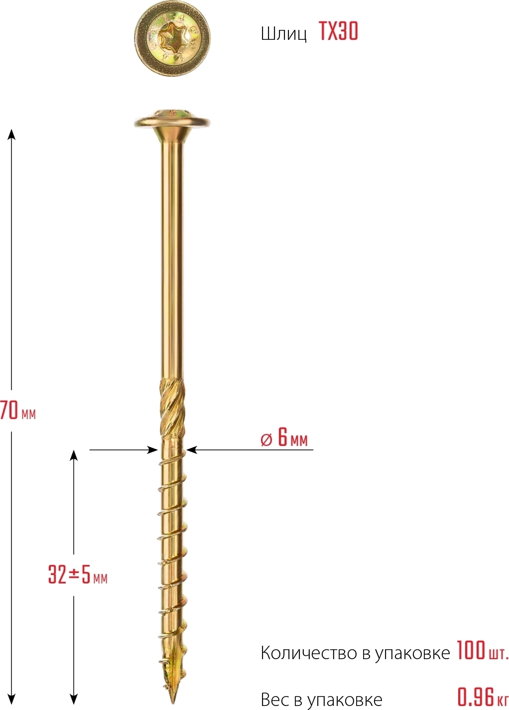 Конструкционный саморез ЗУБР КС-Т 70 х 6.0 мм TX30 тарельчатая головка желтый цинк 100 шт