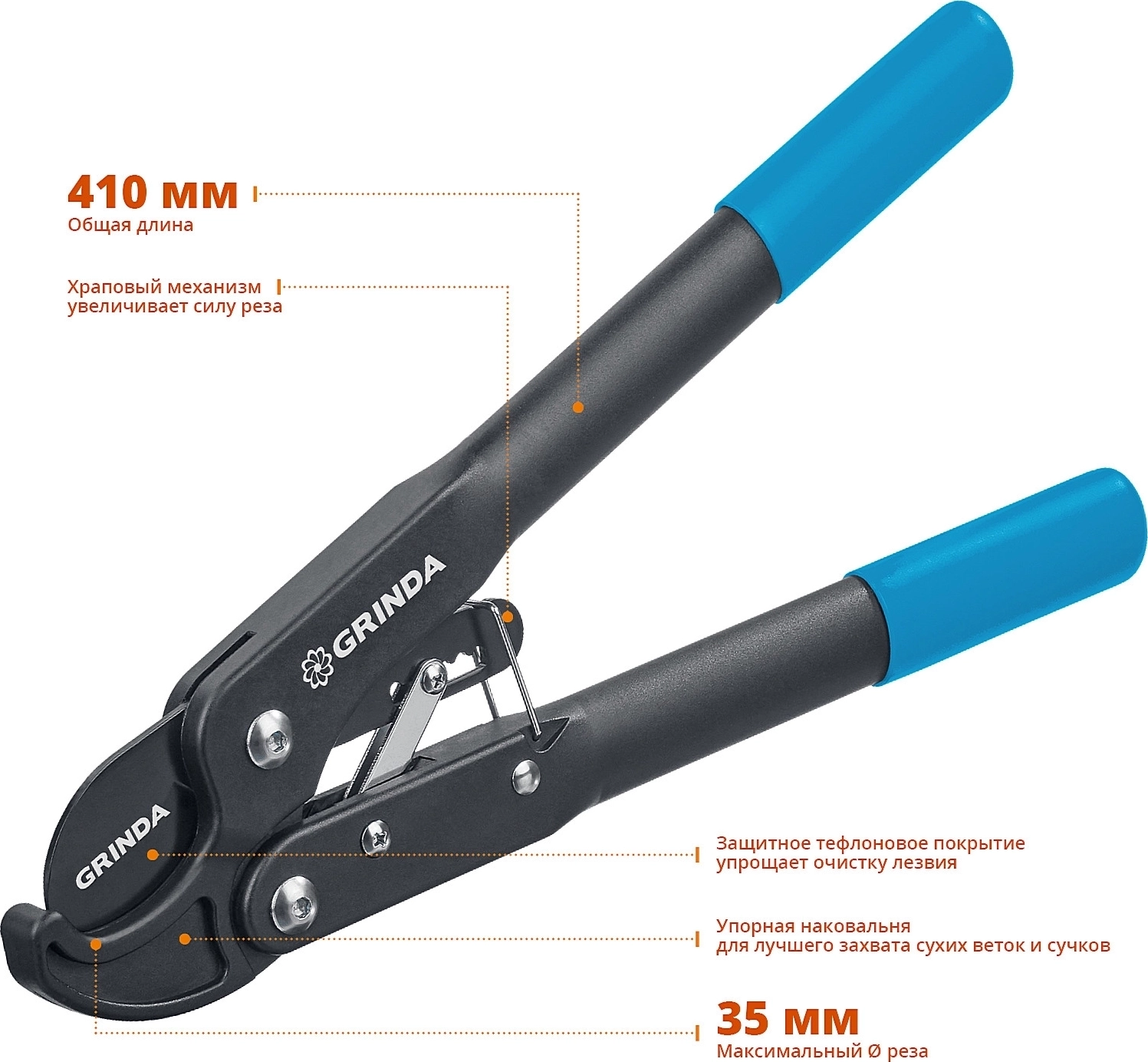 Контактный сучкорез PROLine GRINDA C-410A длина 410 мм лезвия из высокоуглеродистой стали композитные рукоятки храповый механизм