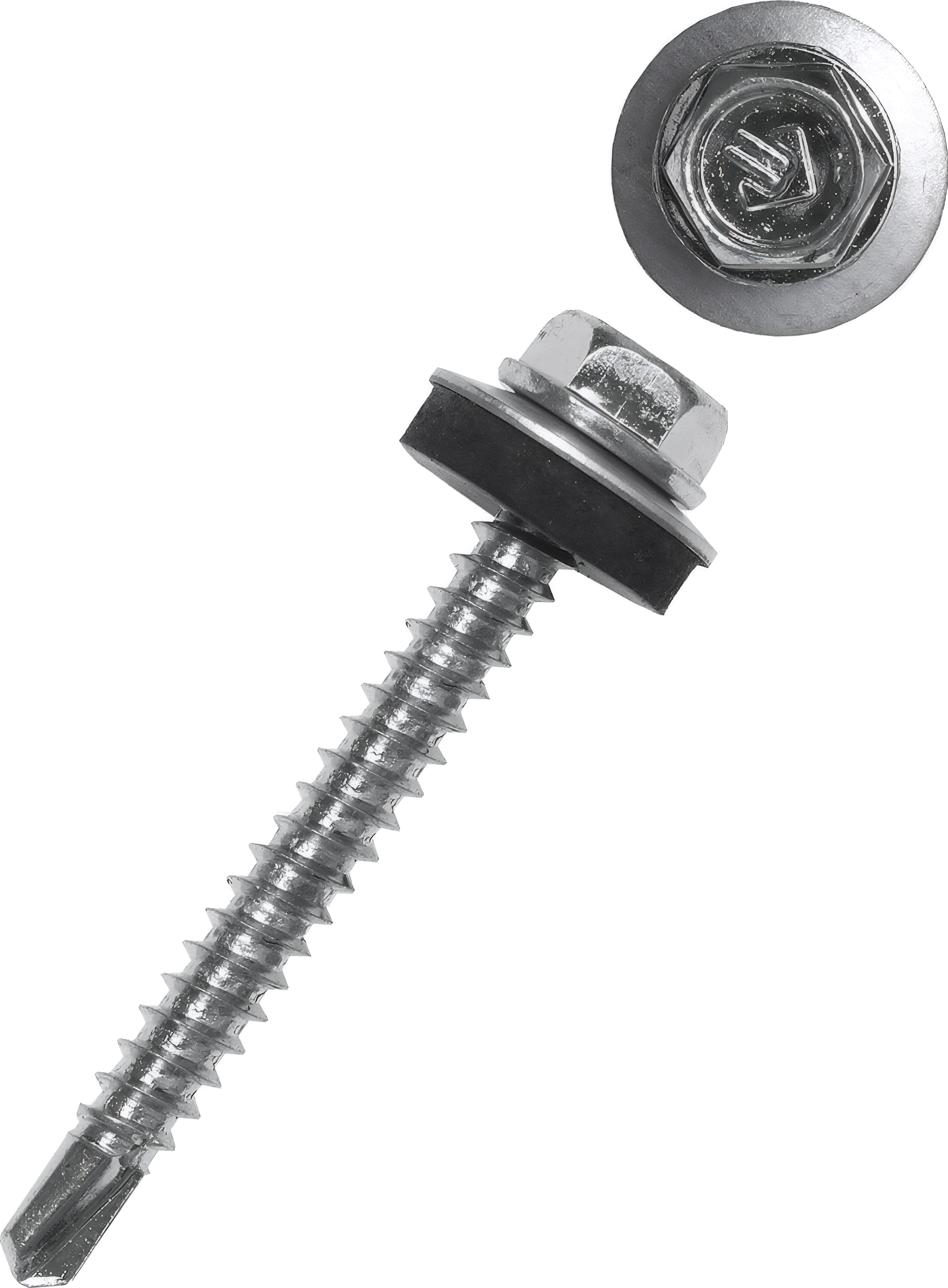 Кровельные саморезы изготовлены из стального прутка с высоким содержанием углерода. Контроль за геометрией самореза начинается с калибровки прутка и заканчивается тщательной проверкой размеров готового изделия. Нормативная твердость стали достигается термической обработкой. Поверхностная твердость мин. 560HV, твердость в сердцевине 240-425HV. Шайба с прокладкой EPDM плотно прижимается к кровельному материалу, герметизируя просверленное отверстие. Шестигранная головка выдерживает большой крутящий момент и значительно облегчает вкручивание самореза. Геометрические размеры: диаметр шайбы (Dw) - 13.90-14.15мм, толщина прокладки (Ar) - 2мм, Размер под ключ (S) - 7.8-7.9мм, диаметр резьбы (D) - 4.75-4.95мм, диаметр сверла (dp) - 2.8-2.9мм, длина сверла (ds) - 4.0-4.8мм, шаг резьбы (Pi) - 2.12мм.
