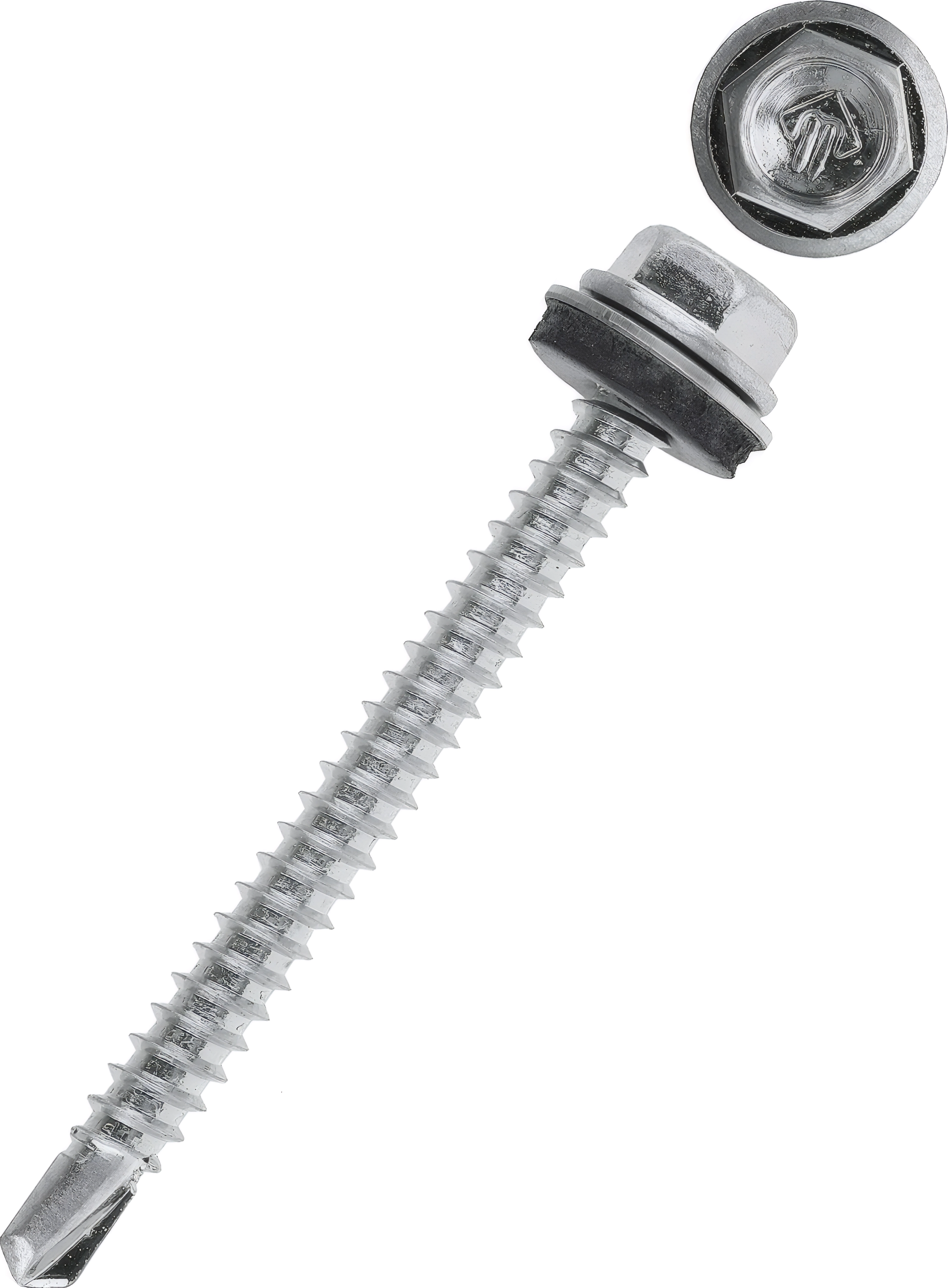 Кровельные саморезы изготовлены из стального прутка с высоким содержанием углерода. Контроль за геометрией самореза начинается с калибровки прутка и заканчивается тщательной проверкой размеров готового изделия. Нормативная твердость стали достигается термической обработкой. Поверхностная твердость мин. 560HV, твердость в сердцевине 240-425HV. Шайба с прокладкой EPDM плотно прижимается к кровельному материалу, герметизируя просверленное отверстие. Шестигранная головка выдерживает большой крутящий момент и значительно облегчает вкручивание самореза. Геометрические размеры: диаметр шайбы (Dw) - 13.90-14.15мм, толщина прокладки (Ar) - 2мм, Размер под ключ (S) - 7.8-7.9мм, диаметр резьбы (D) - 4.75-4.95мм, диаметр сверла (dp) - 2.8-2.9мм, длина сверла (ds) - 4.0-4.8мм, шаг резьбы (Pi) - 2.12мм.
