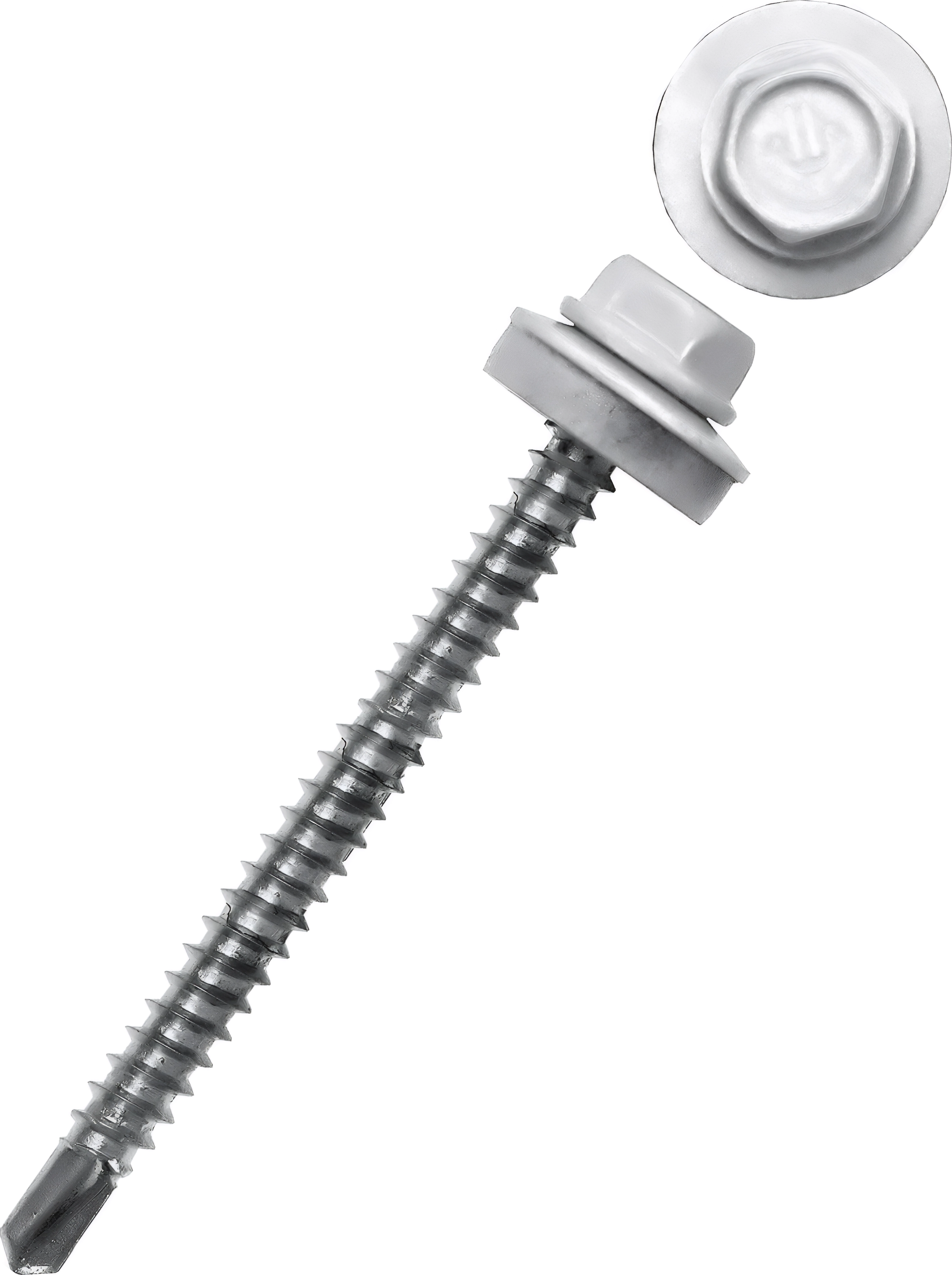 Кровельные саморезы изготовлены из стального прутка с высоким содержанием углерода. Контроль за геометрией самореза начинается с калибровки прутка и заканчивается тщательной проверкой размеров готового изделия. Нормативная твердость стали достигается термической обработкой. Поверхностная твердость мин. 560HV, твердость в сердцевине 240-425HV. Шайба с прокладкой EPDM плотно прижимается к кровельному материалу, герметизируя просверленное отверстие. Шестигранная головка выдерживает большой крутящий момент и значительно облегчает вкручивание самореза. Геометрические размеры: диаметр шайбы (Dw) - 13.90-14.15мм, толщина прокладки (Ar) - 2мм, Размер под ключ (S) - 7.8-7.9мм, диаметр резьбы (D) - 4.75-4.95мм, диаметр сверла (dp) - 2.8-2.9мм, длина сверла (ds) - 4.0-4.8мм, шаг резьбы (Pi) - 2.12мм.