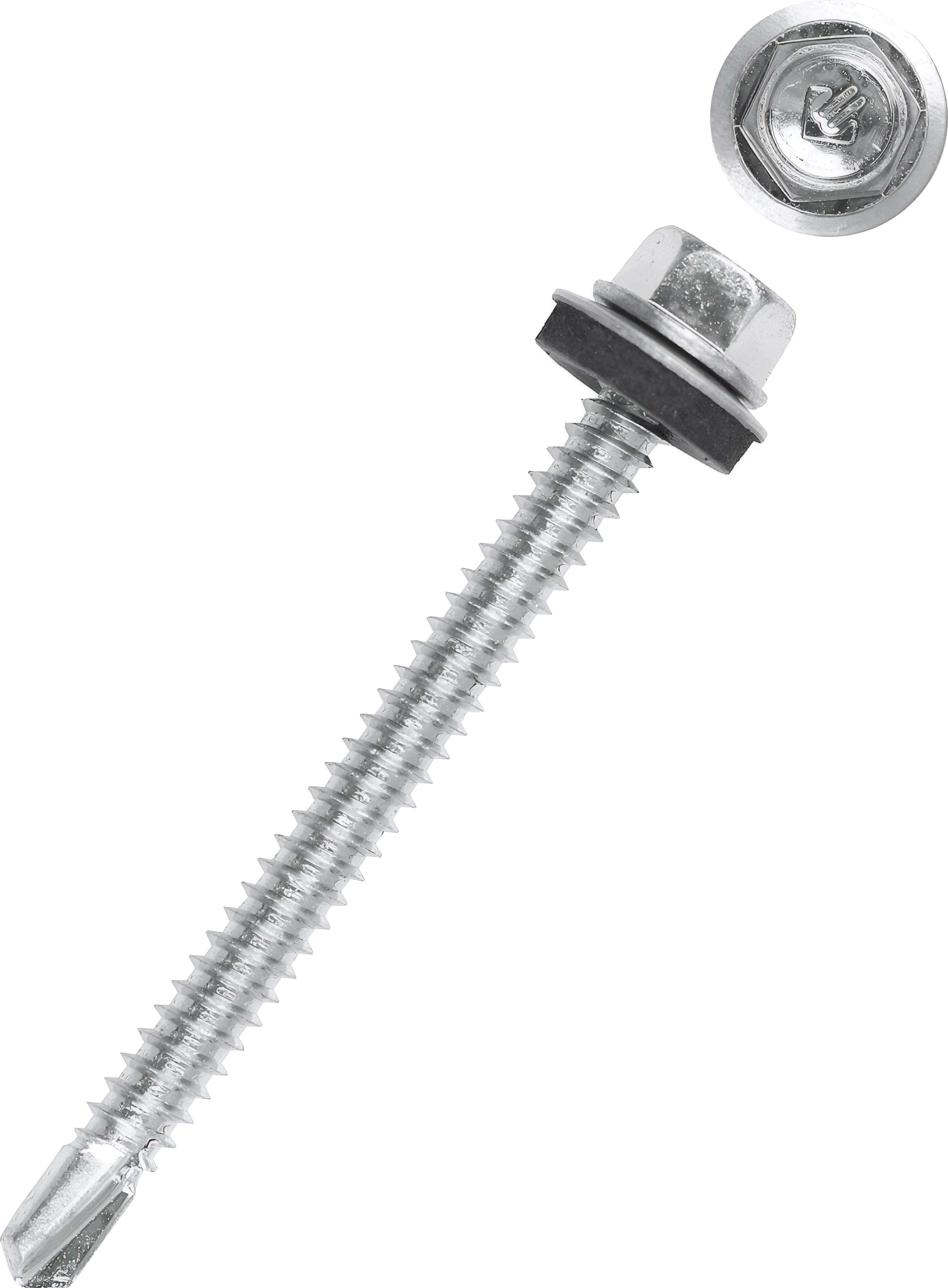 Кровельные саморезы изготовлены из стального прутка с высоким содержанием углерода. Контроль за геометрией самореза начинается с калибровки прутка и заканчивается тщательной проверкой размеров готового изделия. Нормативная твердость стали достигается термической обработкой. Поверхностная твердость мин. 560HV, твердость в сердцевине 240-425HV. Шайба с прокладкой EPDM толщиной 2мм плотно прижимается к кровельному материалу, герметизируя просверленное отверстие. Шестигранная головка выдерживает большой крутящий момент и значительно облегчает вкручивание самореза.