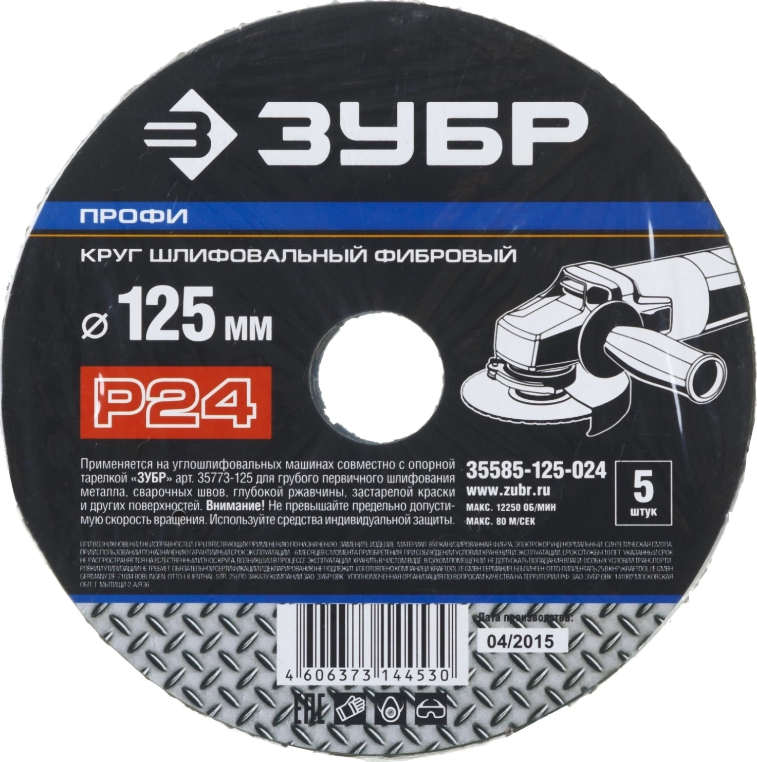 Круг шлифовальный ЗУБР ″ПРОФИ″ фибровый для УШМ P24 125х22мм 5 листов