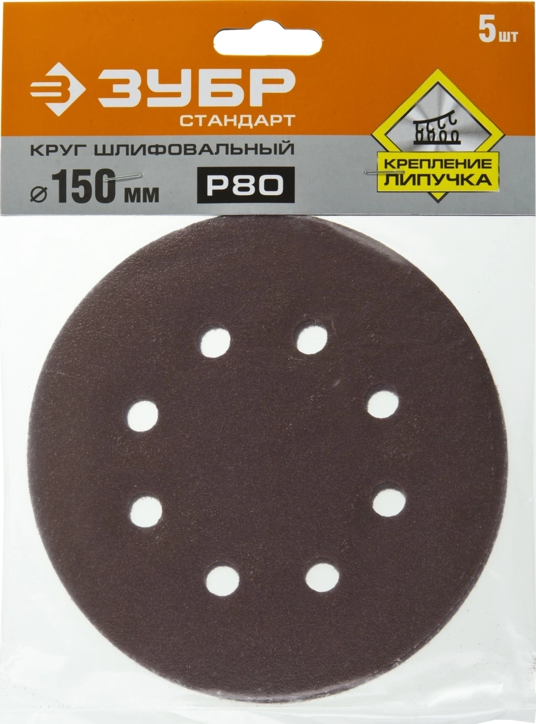 Круг шлифовальный ЗУБР из абразивной бумаги на велкро основе 6 отв. Р80 150мм 5 шт