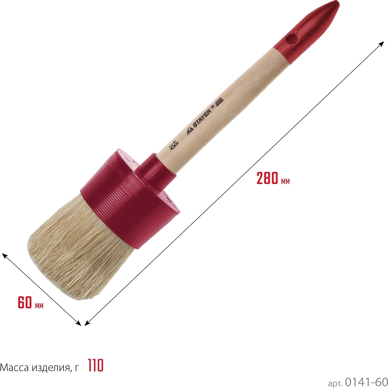 Круглая кисть STAYER UNIVERSAL 60 мм пластмассовый корпус светлая натуральная щетина деревянная ручка все виды ЛКМ 0141-60 - 6 шт