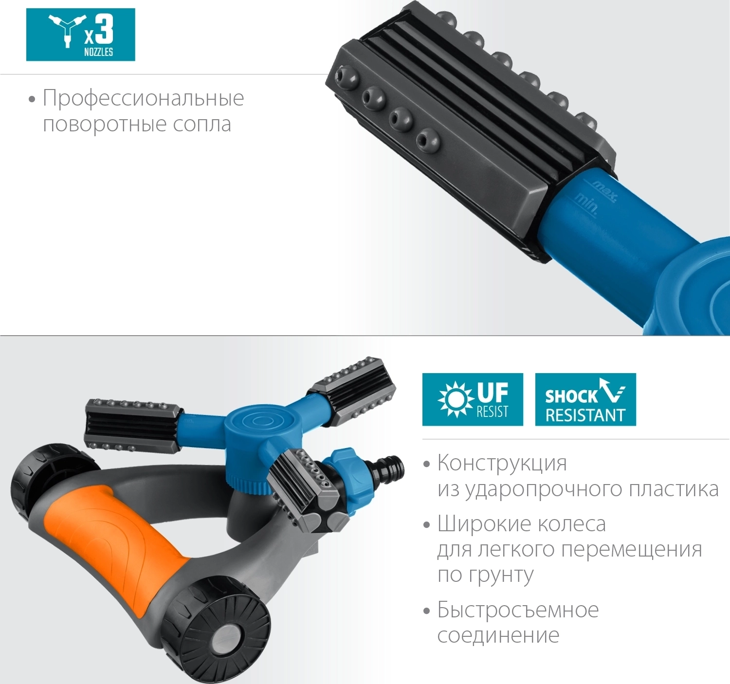 - -3 профессиональных поворотных сопла обеспечивают возможность установки различной интенсивности и площади полива.,