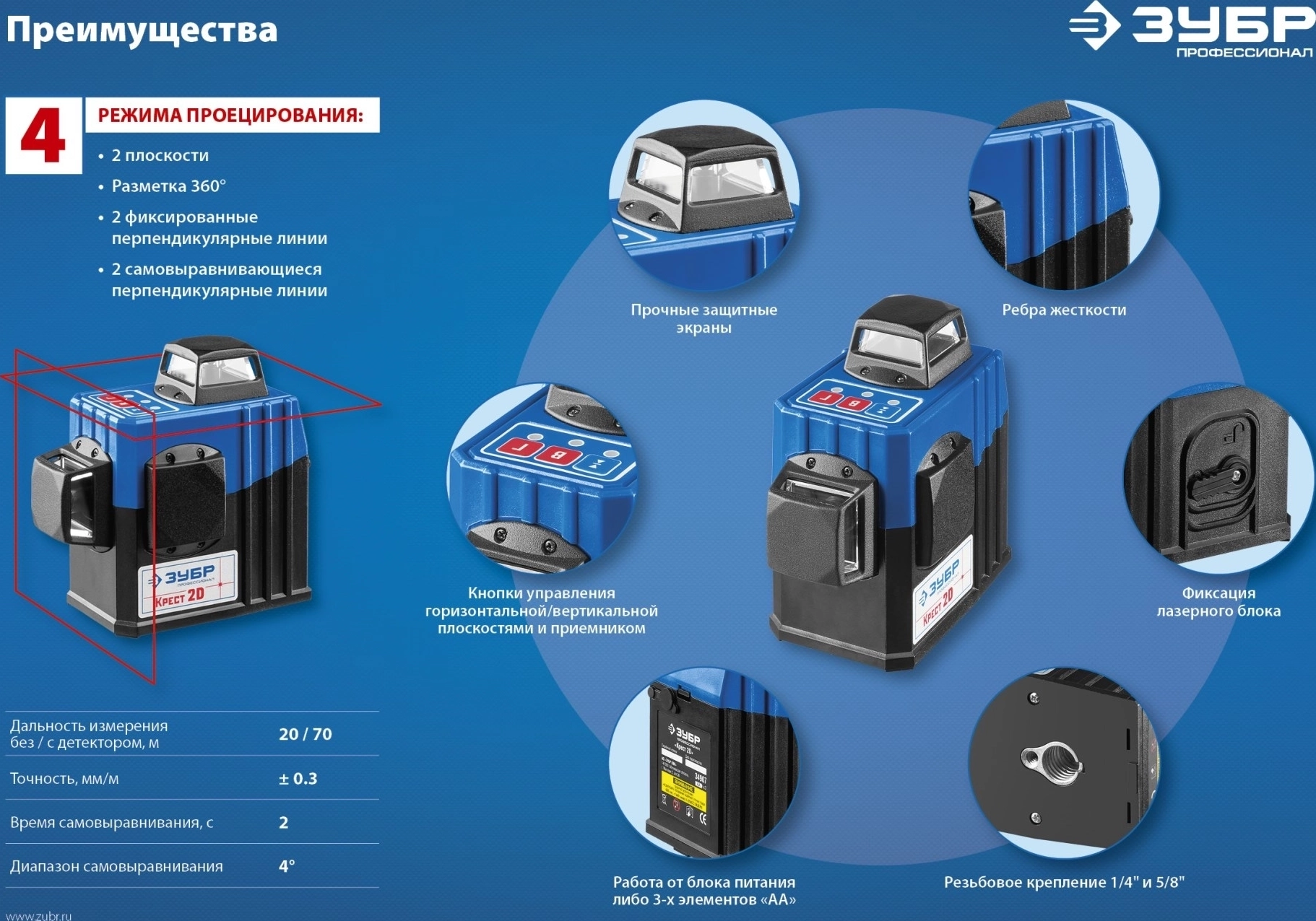 - 2 режима проецирования линий: горизонтальная и две вертикальные линии с развёрткой 360°, благодаря чему луч будет виден в любой точке.