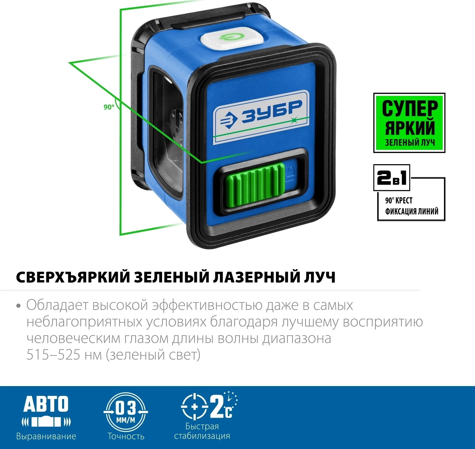 Профессиональный измерительный инструмент для высококачественного выполнения разметочных работ даже в неблагоприятных условиях: ярко освещенных, затемненных, пыльных, влажных помещениях – благодаря лучшему восприятию человеческим глазом длины волны диапазона 515–525 нм (зеленый свет)