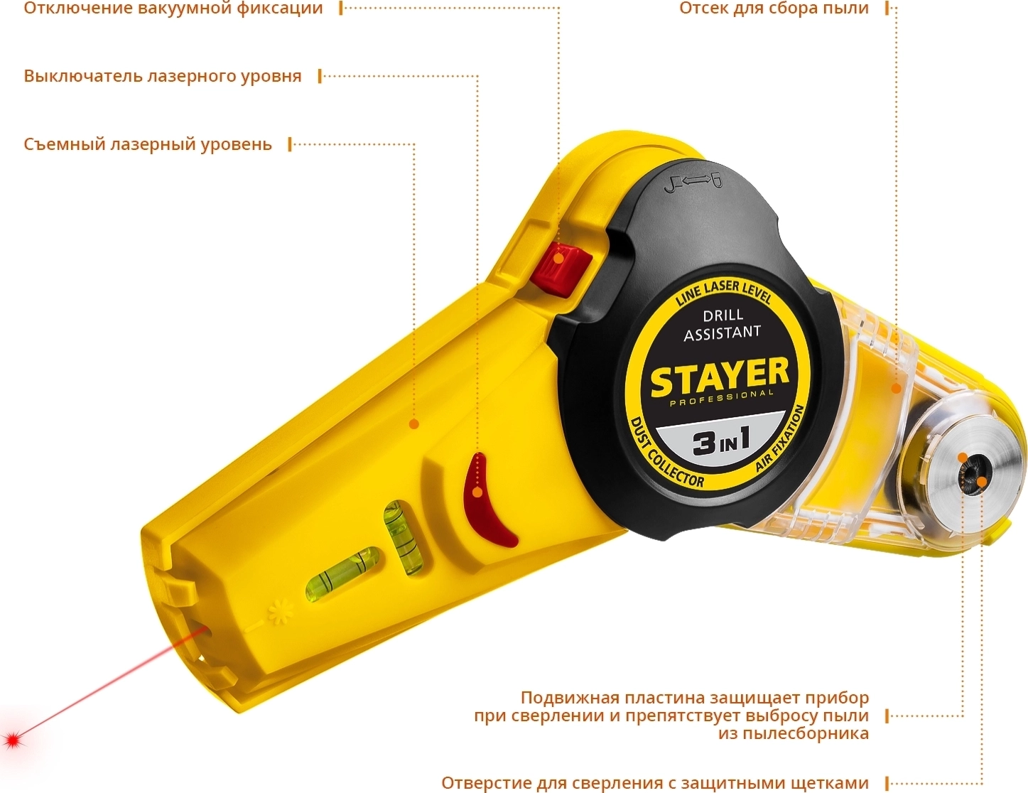 Количество функций: 3 (лазерный уровень, вакуумный фиксатор, сборник пыли.