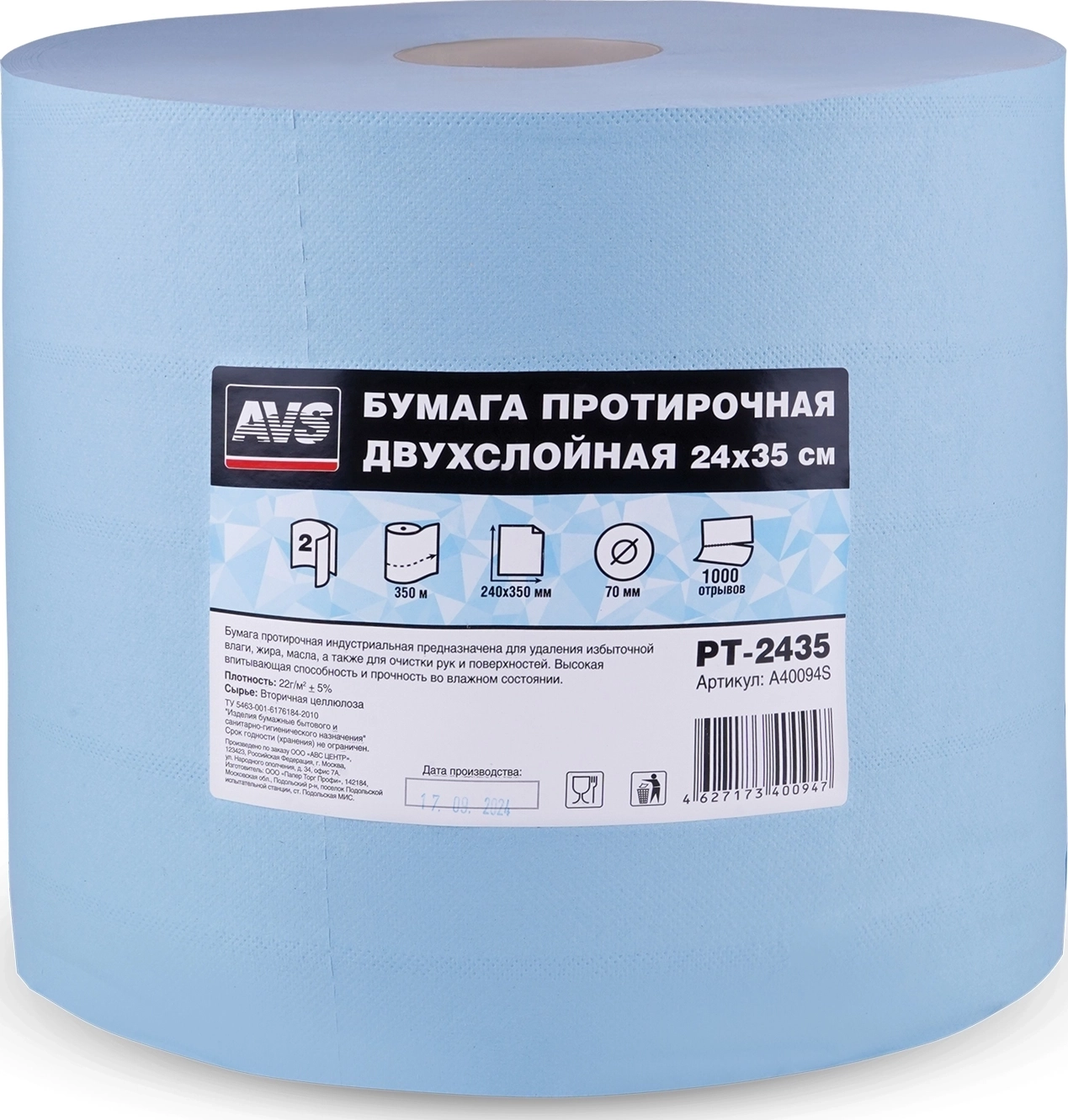 Бумага протирочная двухслойная AVS PT-2435 - цвет голубой, 1000 отрывов, размер 24х35см, плотность ... арт. 60295