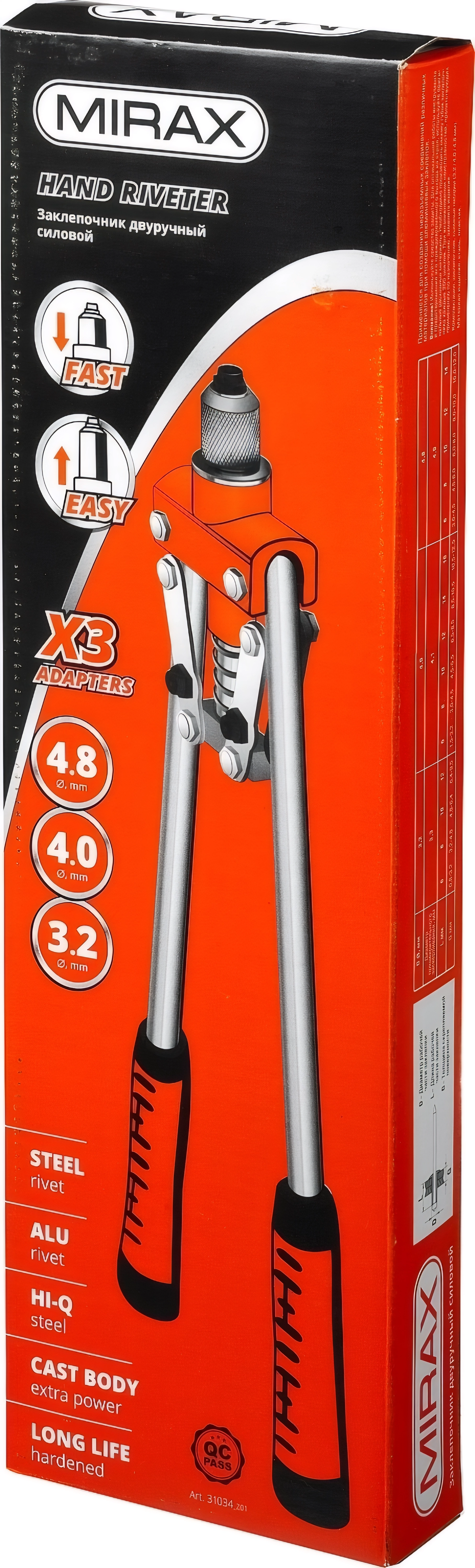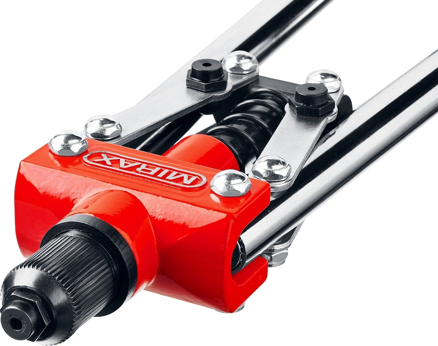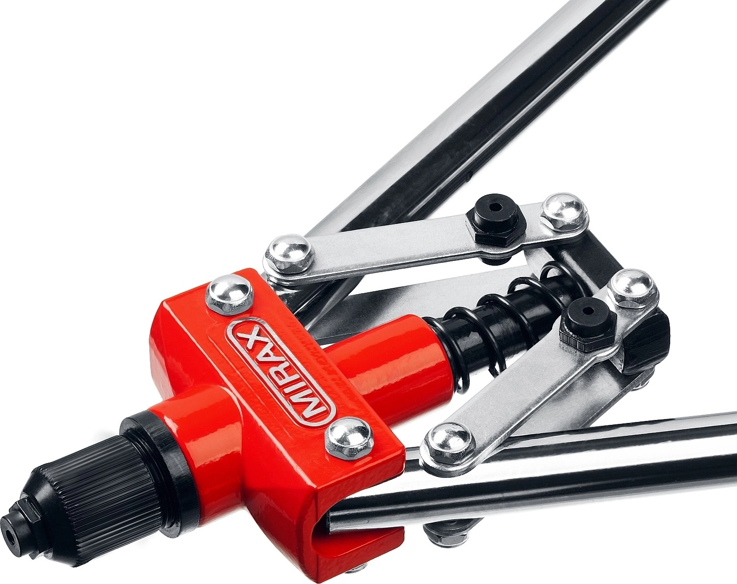 Заклепочник MIRAX благодаря двухрычажной конструкции механизма многократно увеличивает прилагаемое усилие, что позволяет снизить утомляемость при длительной работе.