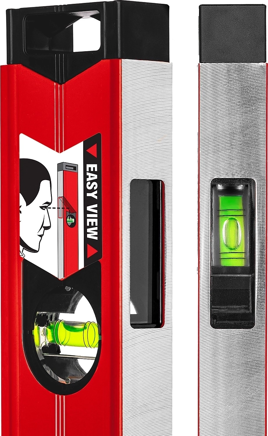 Предназначен для контроля горизонтальности и вертикальности поверхностей. Порядок работы: Установите уровень базовой поверхностью на измеряемую плоскость. Поверхность горизонтальна (вертикальна), если воздушный пузырек находится посередине между двумя центральными насечками соответствующего глазка. Внимание! Строительный уровень является точным измерительным прибором. Оберегайте прибор от механических повреждений. Перед работой проверьте точность показаний уровня путем сравнения показаний при повороте уровня на 180° вокруг оси, перпендикулярной измерительным плоскостям.