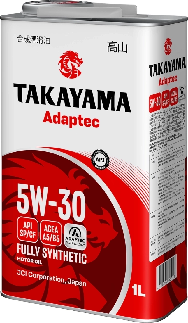 Полностью синтетическое моторное масло TAKAYAMA Adaptec SAE 5W-30 АCEA A5/B5 API SP/CF разработано для всесезонного применения в бензиновых и дизельных двигателях легковых автомобилей, микроавтобусов, внедорожников и лёгких грузовиков, в том числе оборудованных турбонаддувом и непосредственным впрыском. Производится из высококачественных базовых масел и многофункционального пакета присадок с использованием технологии Adaptec, которая обеспечивает минимальный коэффициент трения и превосходную защиту двигателя от износа при его работе в режимах высоких температур и высоких нагрузок. Обладает отличной термической стабильностью и стойкостью к высокотемпературному окислению, обеспечивает экономию топлива, предотвращает образование всех видов отложений в двигателе даже в режиме максимальных нагрузок, имеет хорошие низкотемпературные свойства, способствуя уверенному запуску двигателя при низких температурах.