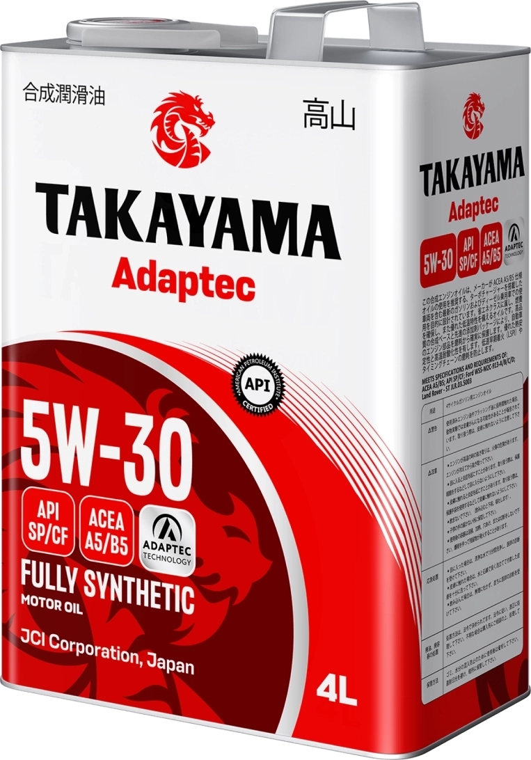 Полностью синтетическое моторное масло TAKAYAMA Adaptec SAE 5W-30 АCEA A5/B5 API SP/CF разработано для всесезонного применения в бензиновых и дизельных двигателях легковых автомобилей, микроавтобусов, внедорожников и лёгких грузовиков, в том числе оборудованных турбонаддувом и непосредственным впрыском. Производится из высококачественных базовых масел и многофункционального пакета присадок с использованием технологии Adaptec, которая обеспечивает минимальный коэффициент трения и превосходную защиту двигателя от износа при его работе в режимах высоких температур и высоких нагрузок. Обладает отличной термической стабильностью и стойкостью к высокотемпературному окислению, обеспечивает экономию топлива, предотвращает образование всех видов отложений в двигателе даже в режиме максимальных нагрузок, имеет хорошие низкотемпературные свойства, способствуя уверенному запуску двигателя при низких температурах.