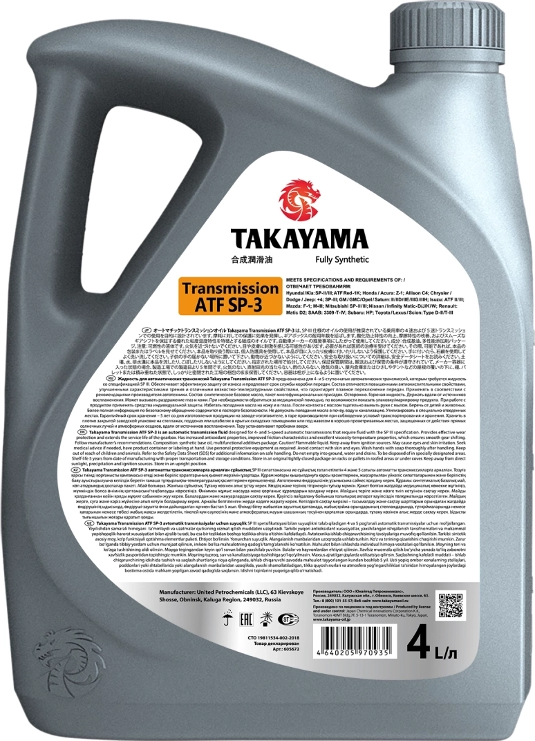 Жидкость для автоматических трансмиссий «TAKAYAMA ATF SP-3» предназначена для 4-5 ступенчатых автоматических трансмиссий, которым требуется жидкость со спецификацией SP III. Обеспечивает эффективную защиту от износа и продлевает срок службы коробки передач.
