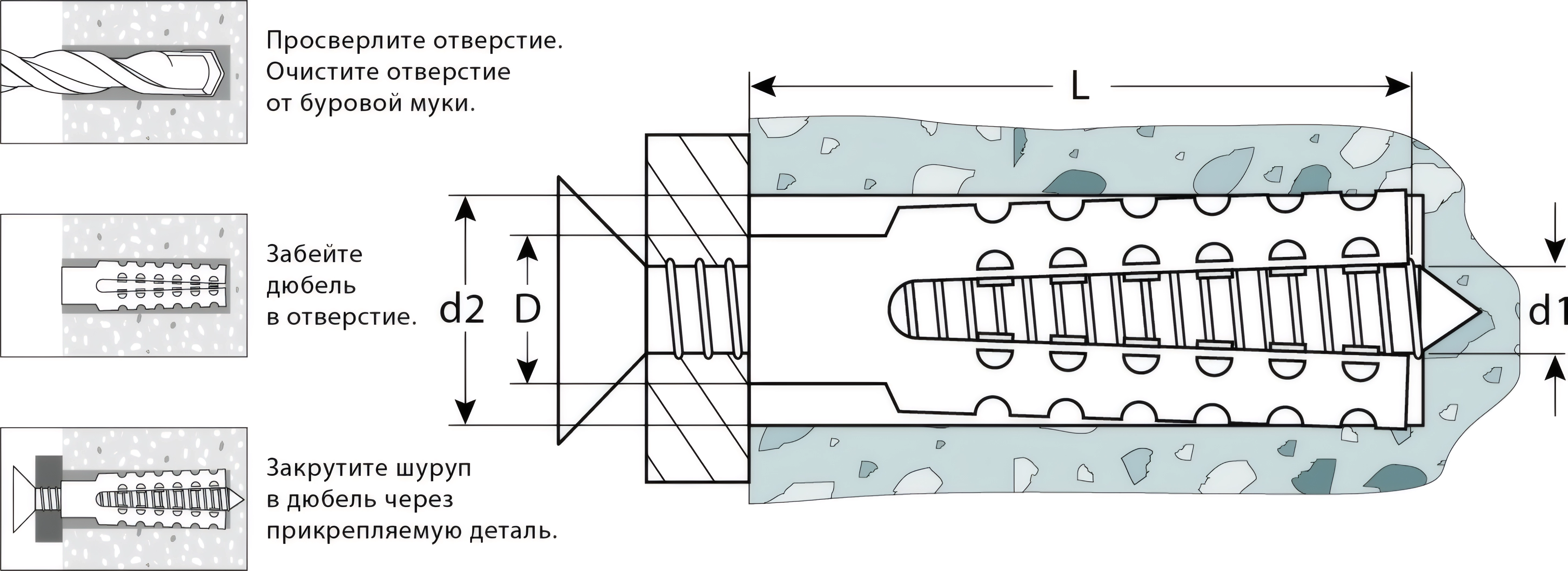 - Простота установки - дюбель вставляется в предварительно просверленное отверстие и расклинивается при вкручивании шурупа