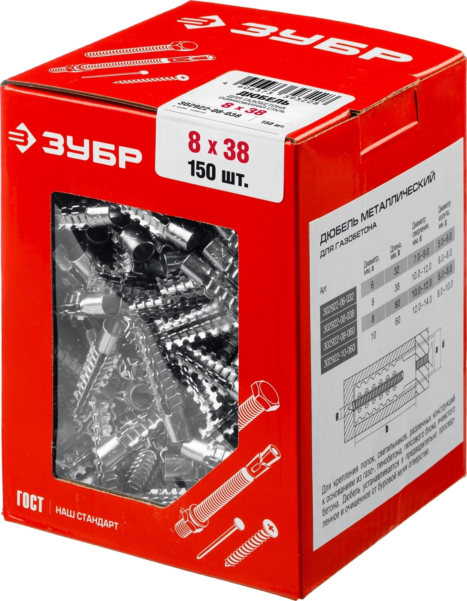 Металлический дюбель для газобетона ЗУБР 8 х 38 мм, 150 шт