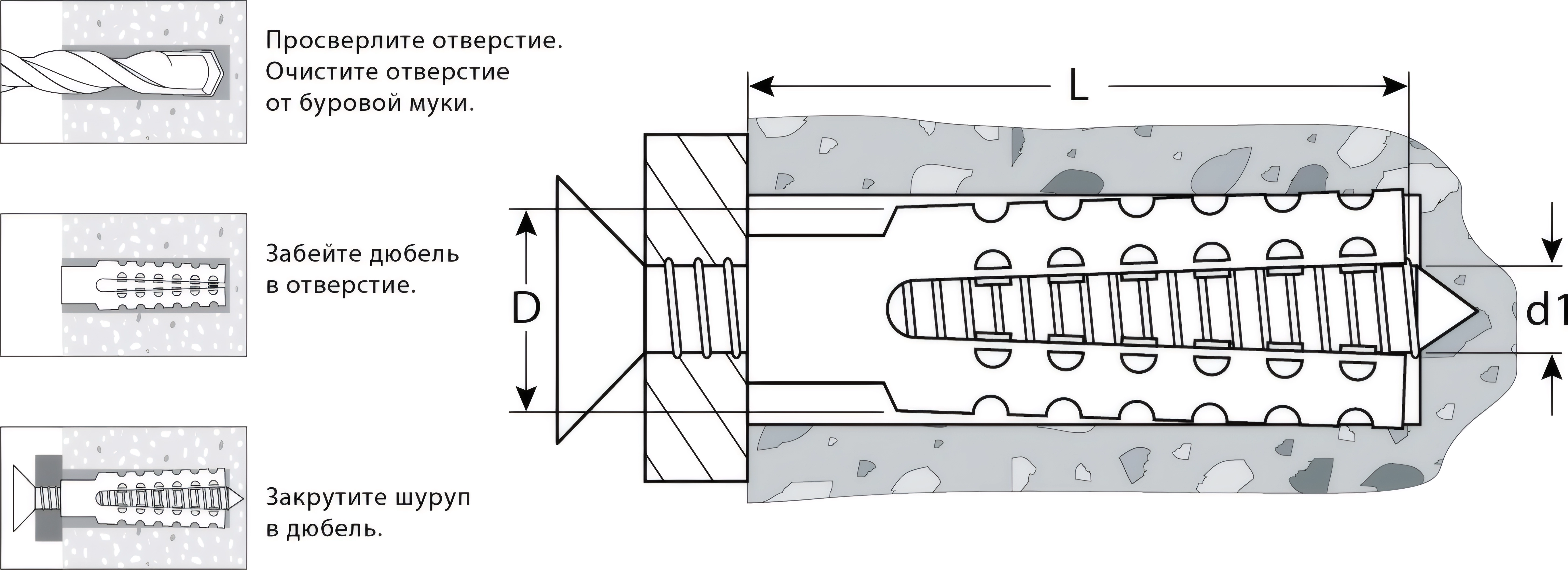 - Простота установки - дюбель вставляется в предварительно просверленное отверстие и расклинивается при вкручивании шурупа