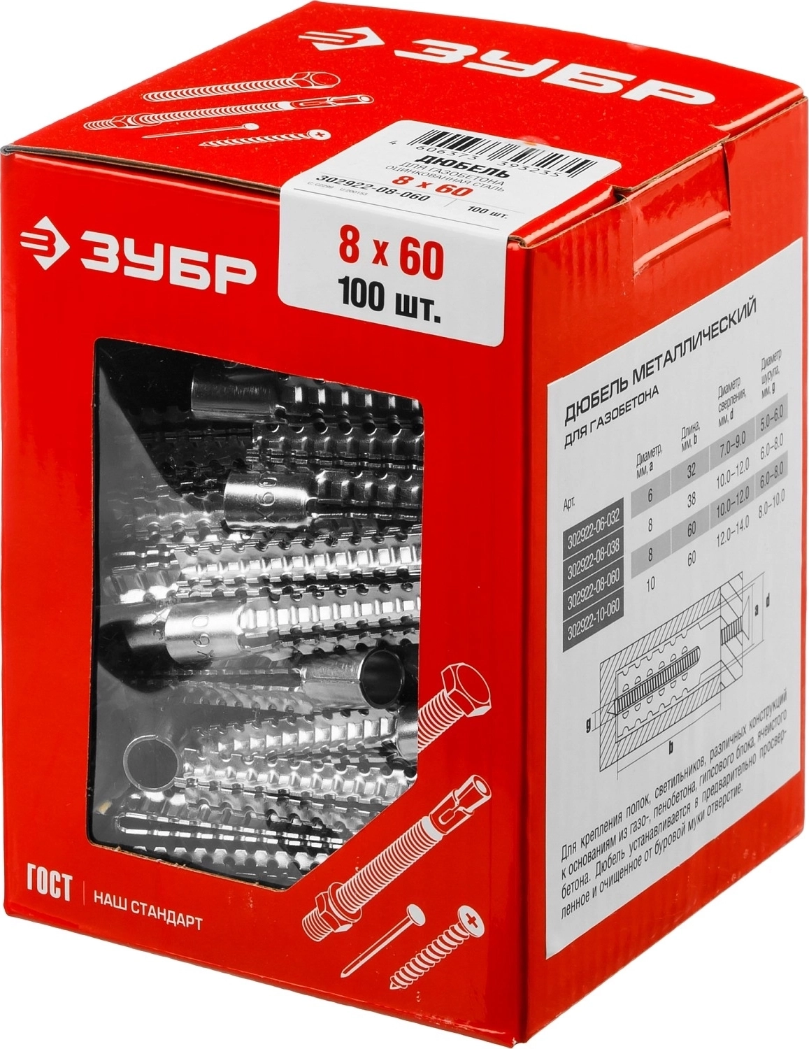 Металлический дюбель для газобетона ЗУБР 8 х 60 мм, 100 шт