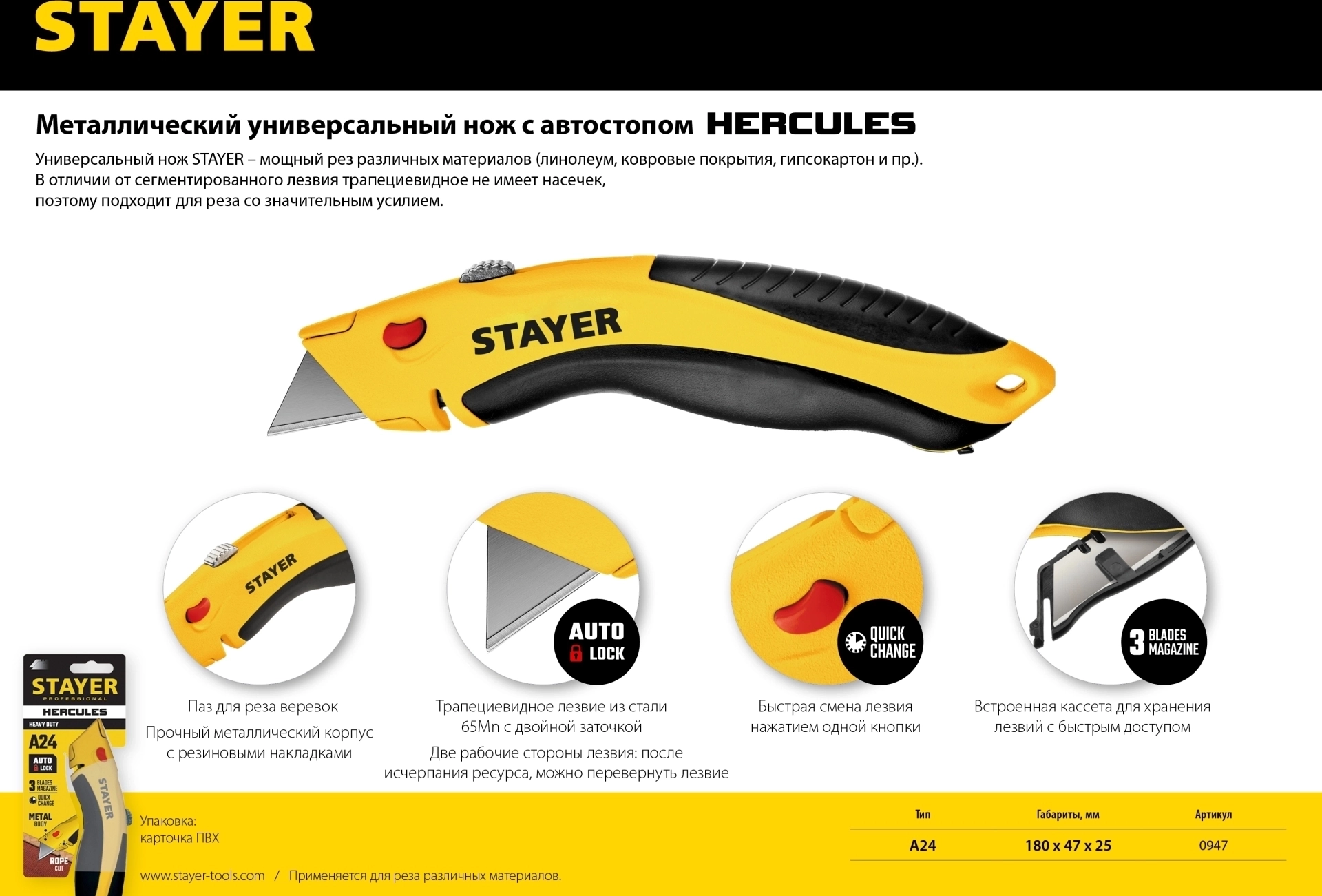 Металлический нож Professional STAYER Hercules-A24 универсальный с трапециевидным лезвием