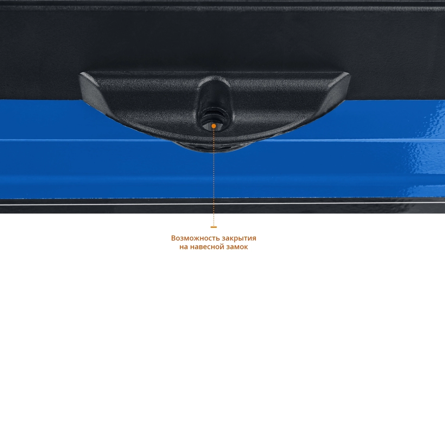 Прочный металлический ящик позволяет организвовать удобное и надежное хранение большого количества инструментов. Широкая алюминиевая рукоятка помогает сместить центр тяжести ящика если это необходимо