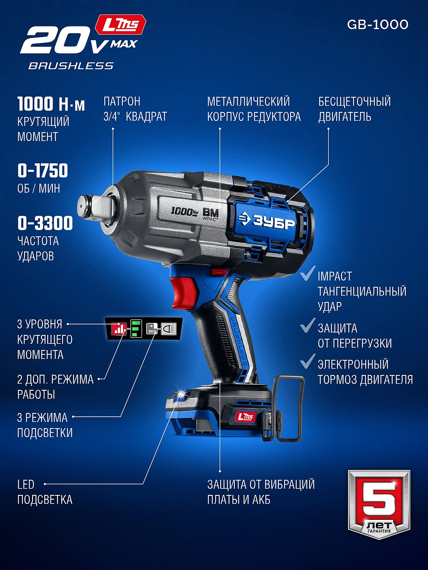 ПРОФЕССИОНАЛ 20 В, 1000 Н·м, 2 АКБ LMS (4 А·ч), бесщеточный ударный гайковерт, кейс арт. 121989