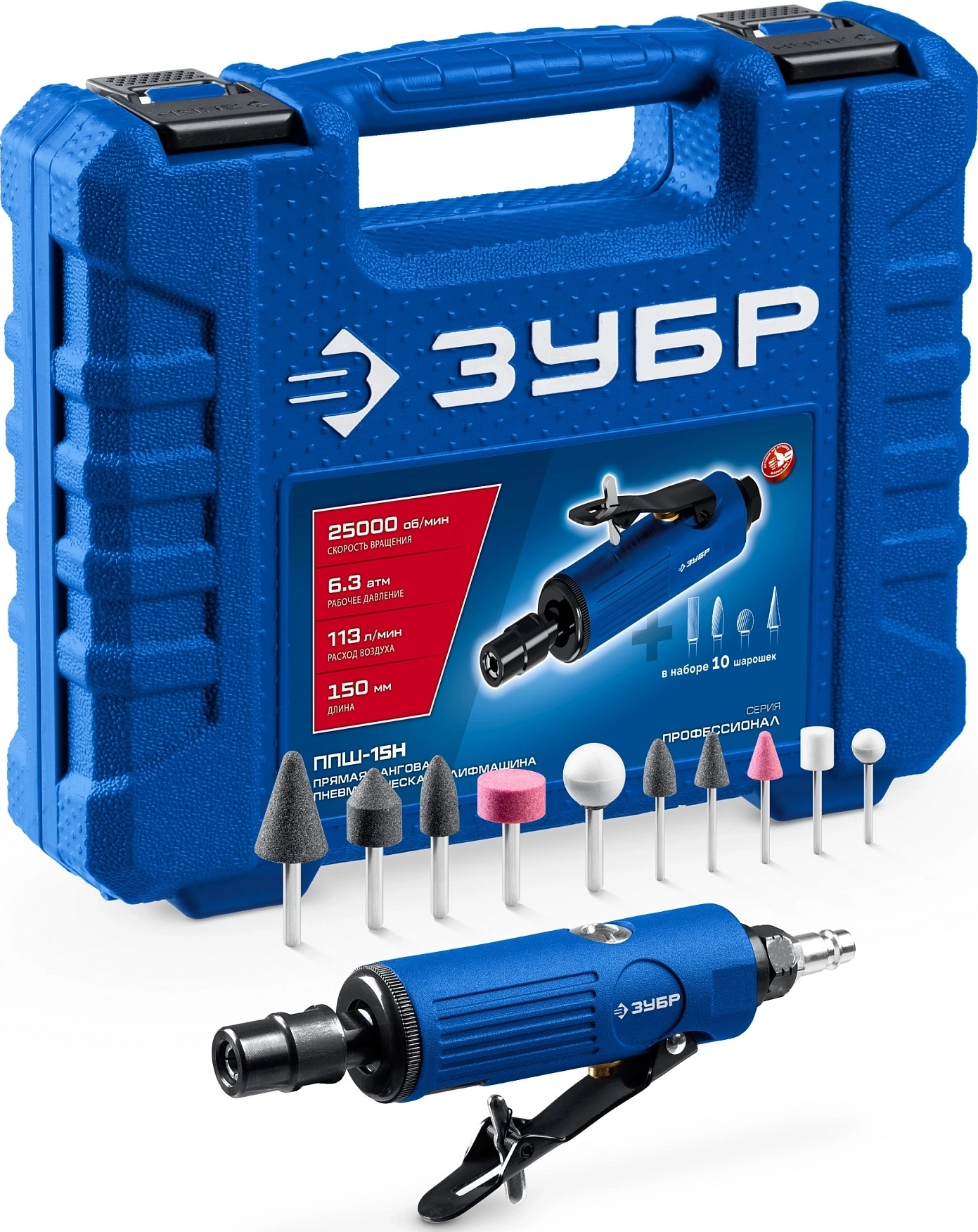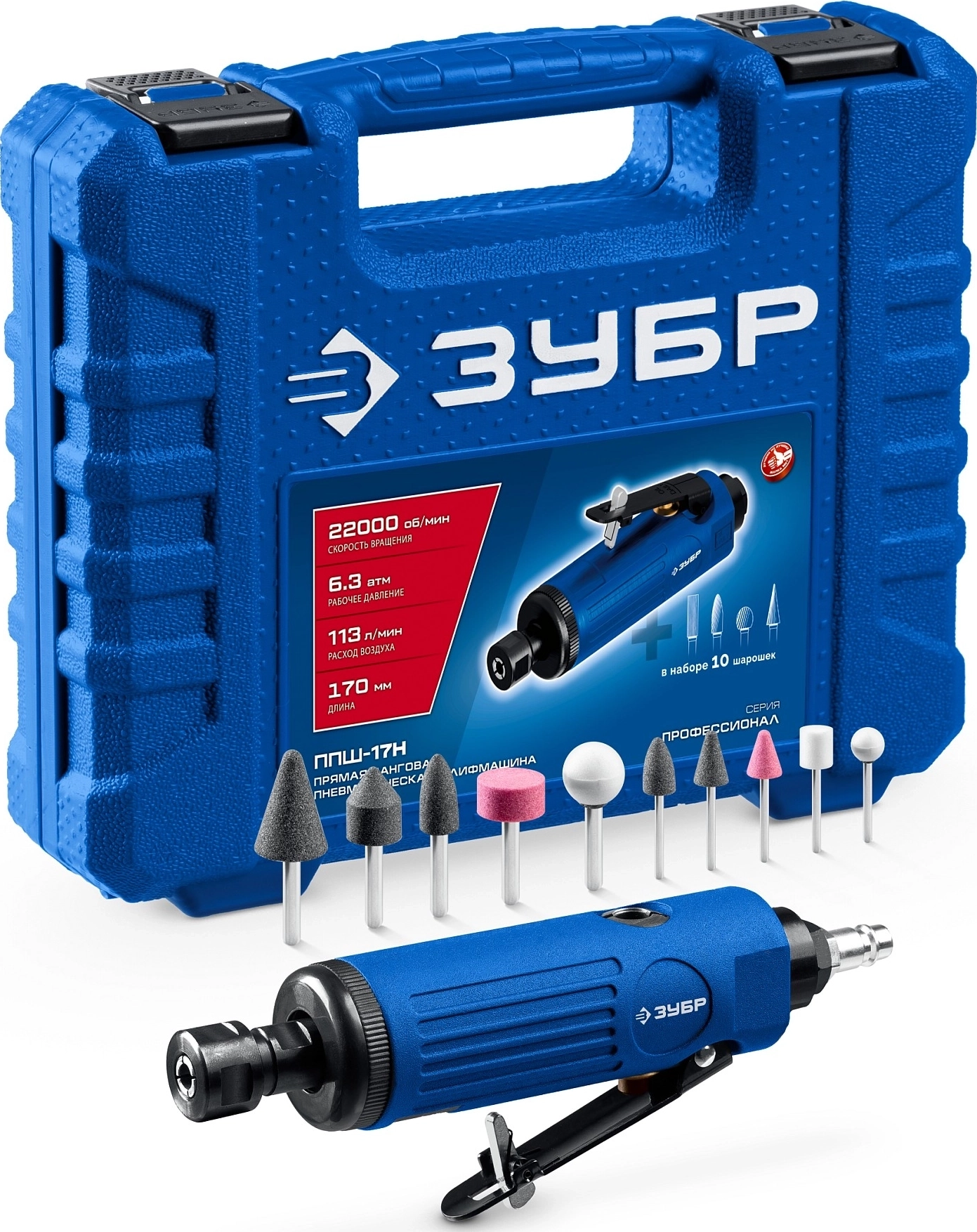 ПРОФЕССИОНАЛ набор в кейсе: прямая цанговая пневмошлифмашина, 10 шарошек и оснастка арт. 117714