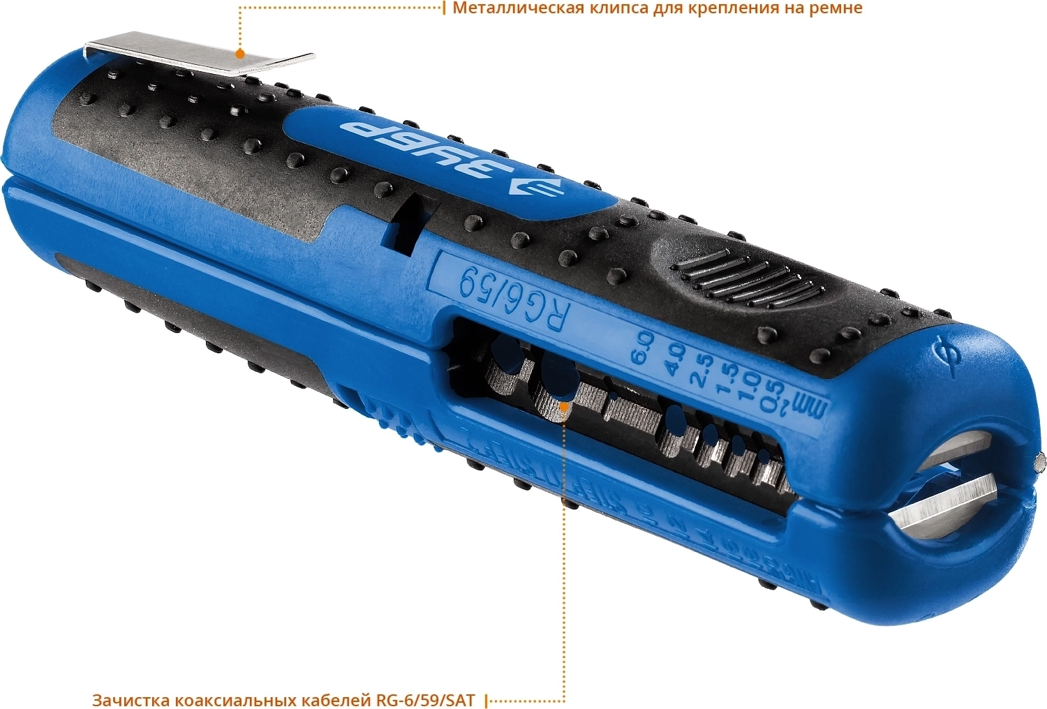 для снятия изоляции и обрезки проводов, зачистки коаксиальных кабелей RG-6/ SAT. RG59