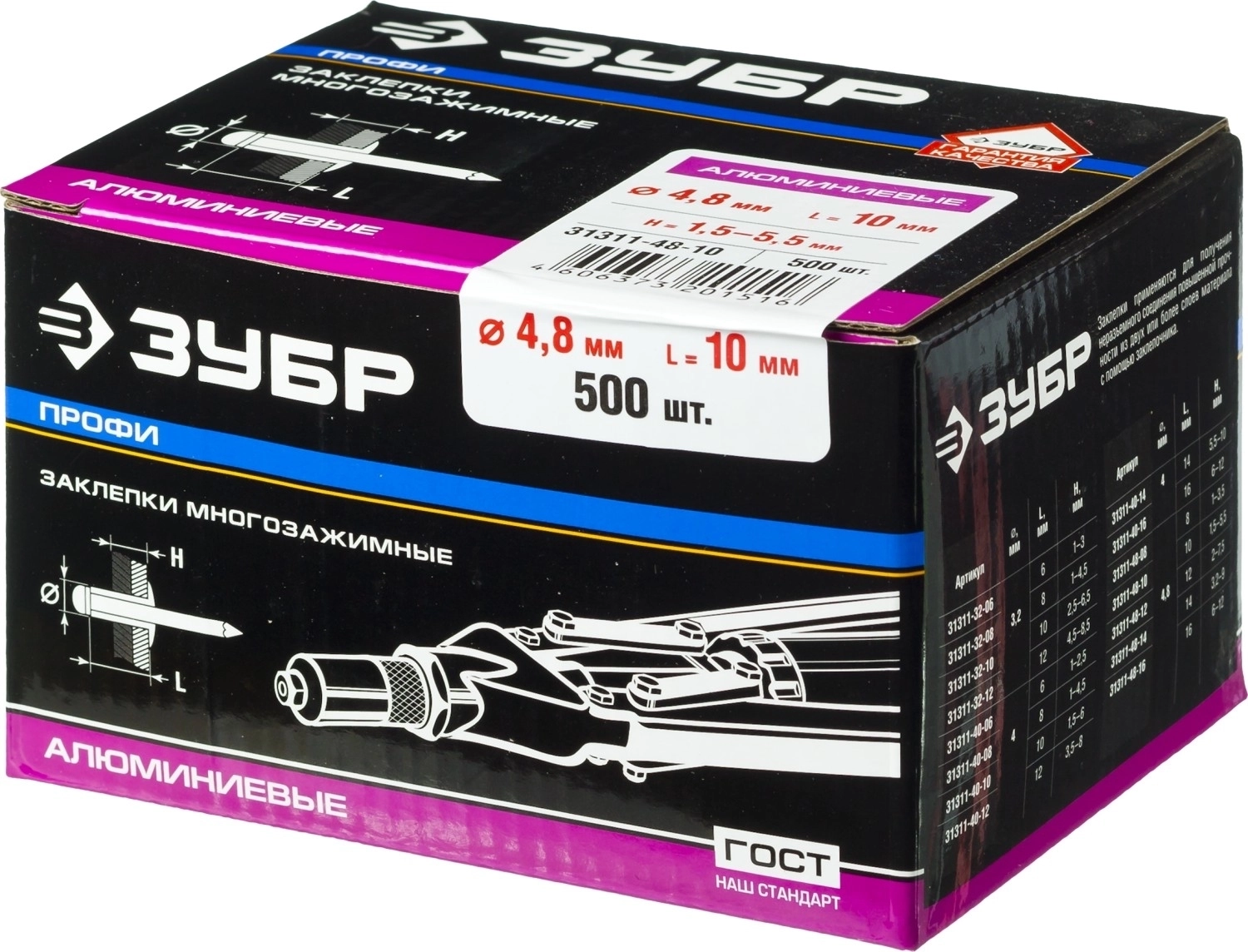 Многозажимные алюминиевые заклепки ЗУБР 4.8 x 10 мм Al5052 500 шт