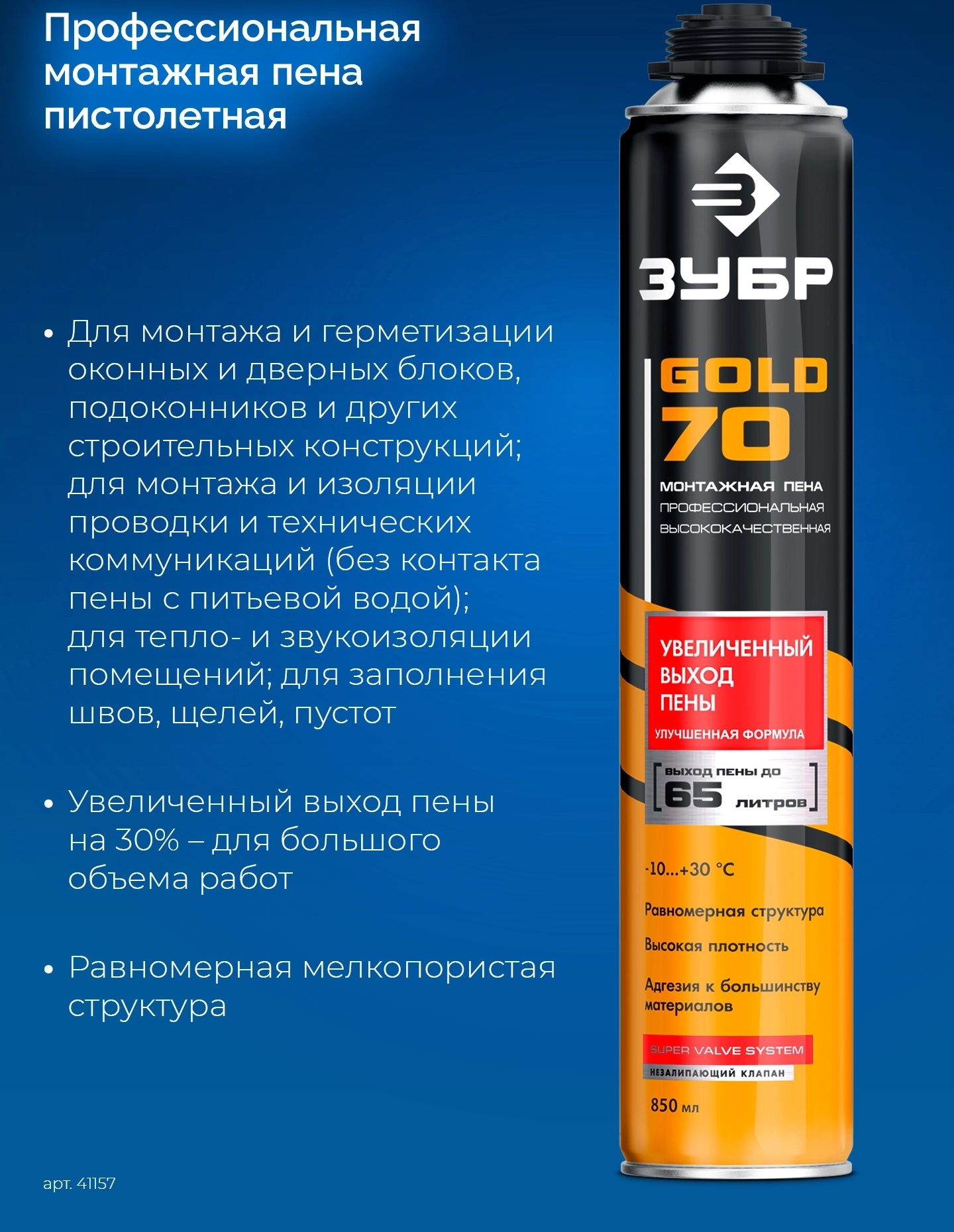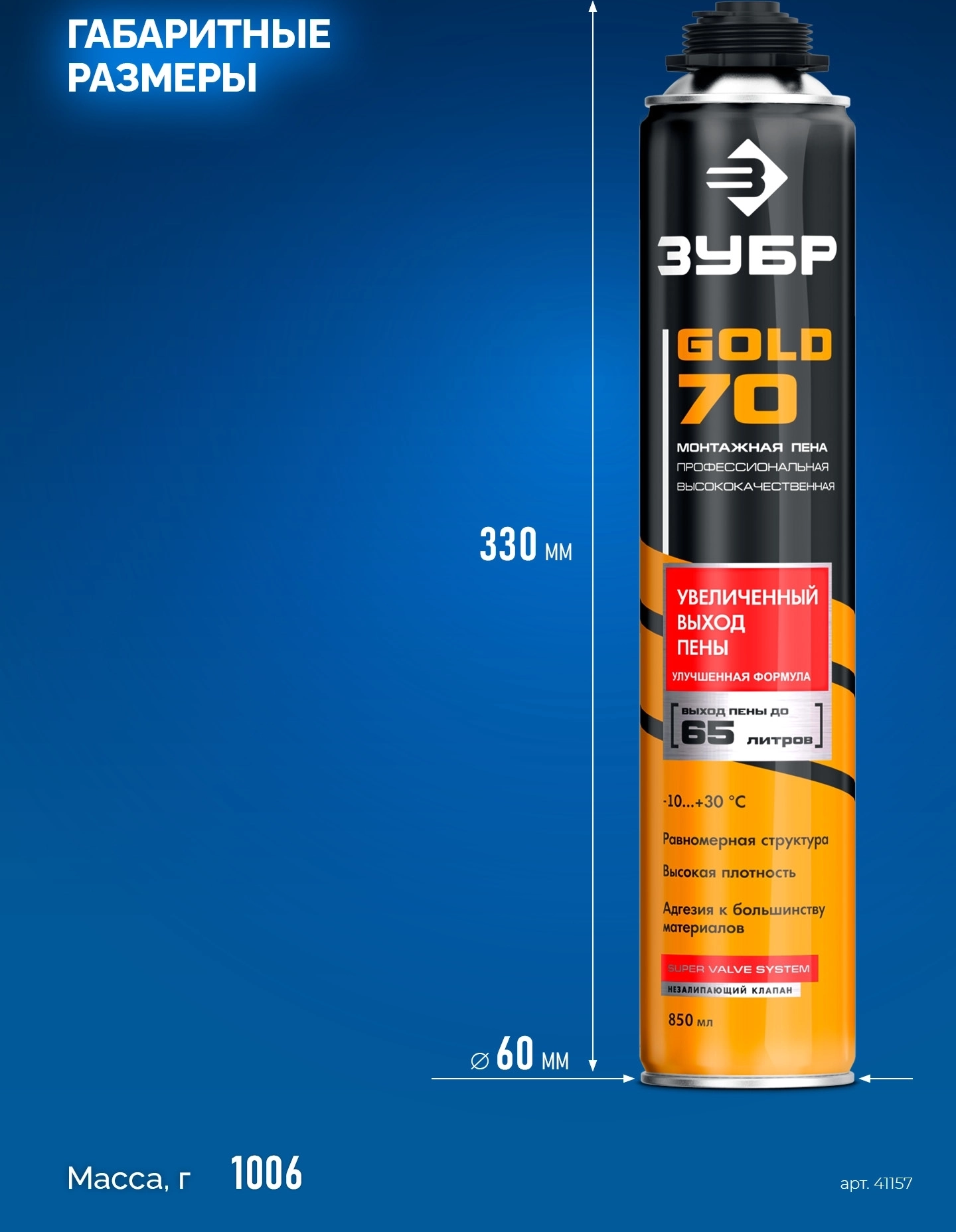 Монтажная пена ЗУБР GOLD PRO 65, 850 мл, мелкопористая, c выходом до 65 л, пистолетная