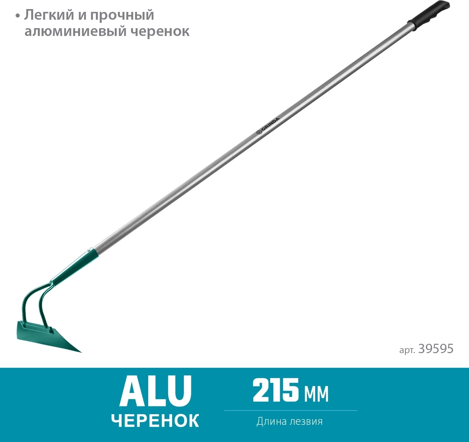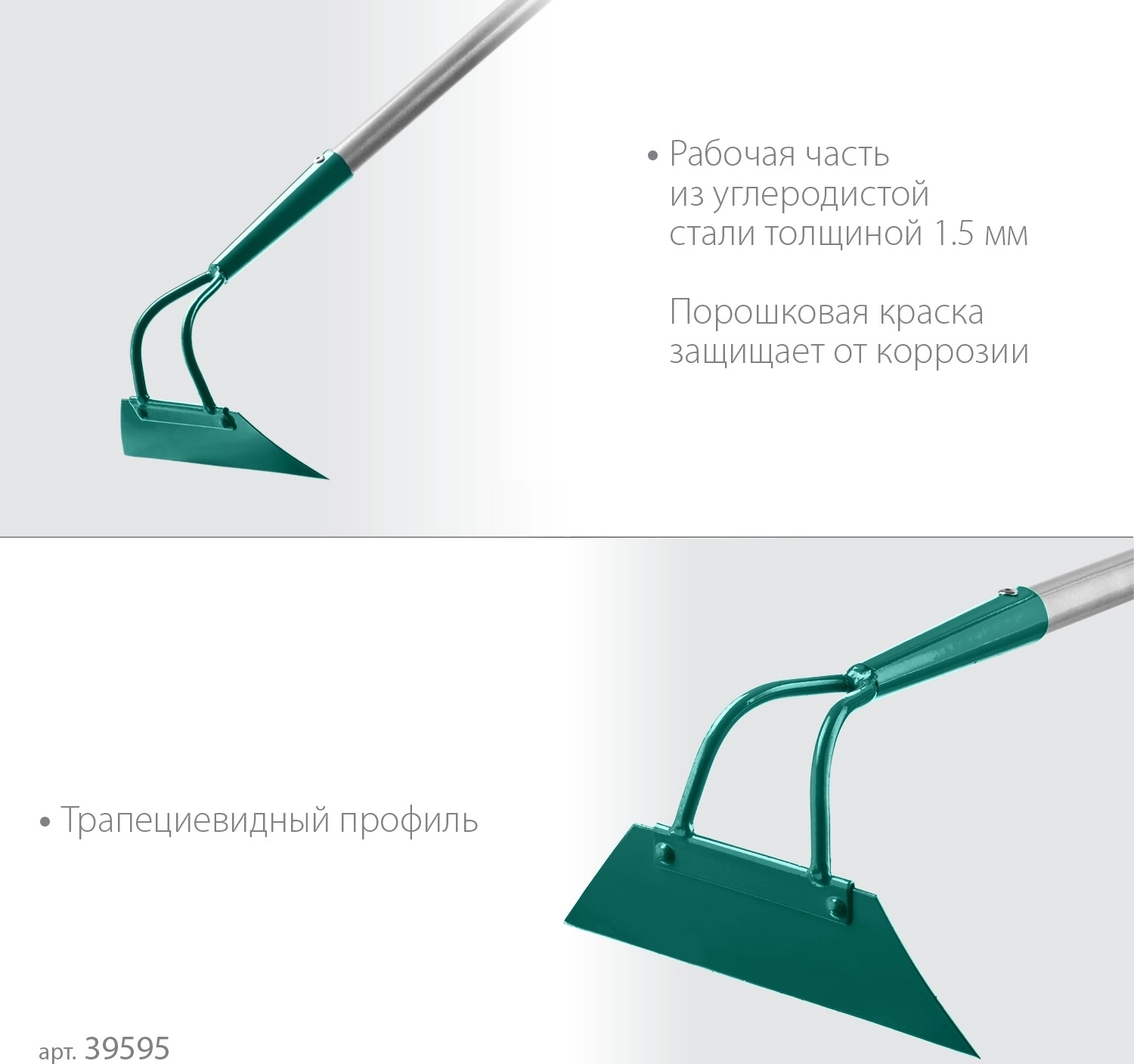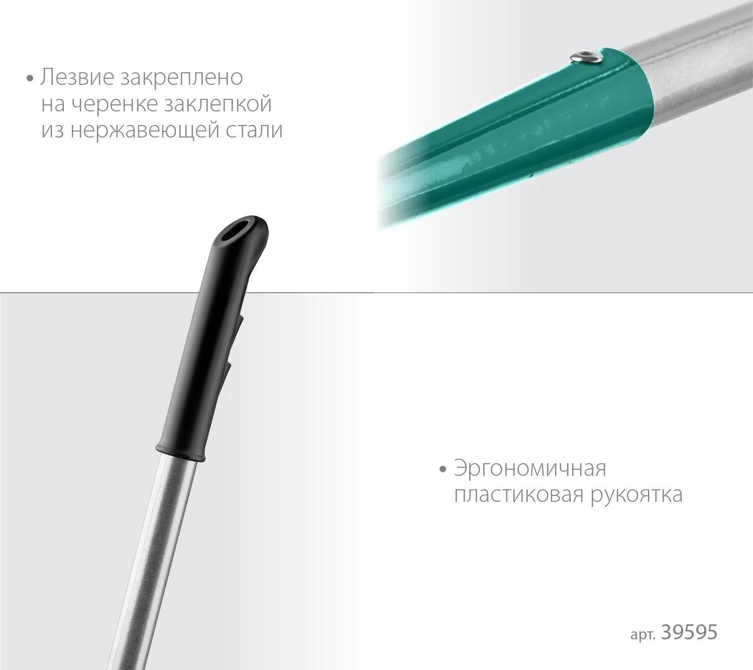 - Лёгкий и прочный алюминиевый черенок позволяет затрачивать значительно меньше усилий во время работы и увеличивает срок службы изделия