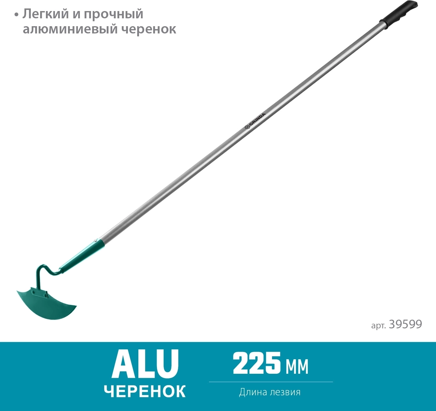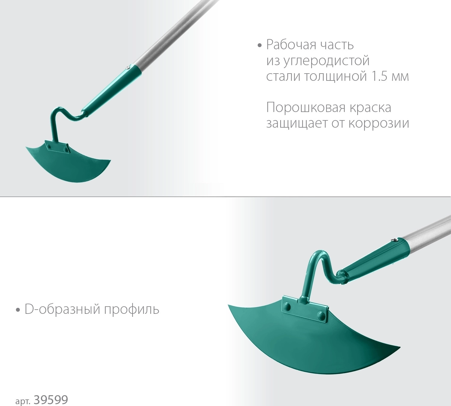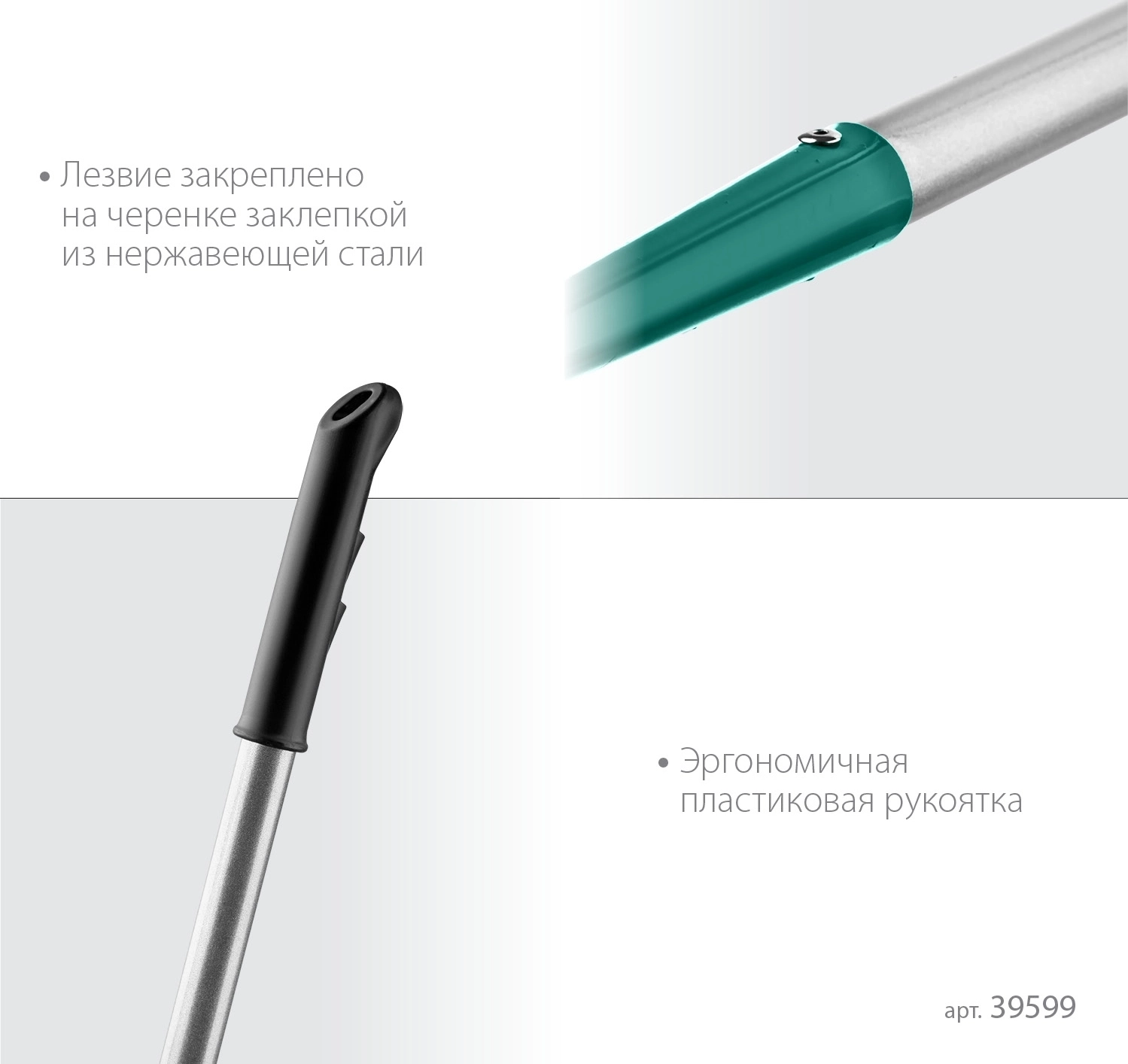 - Лёгкий и прочный алюминиевый черенок позволяет затрачивать значительно меньше усилий во время работы и увеличивает срок службы изделия