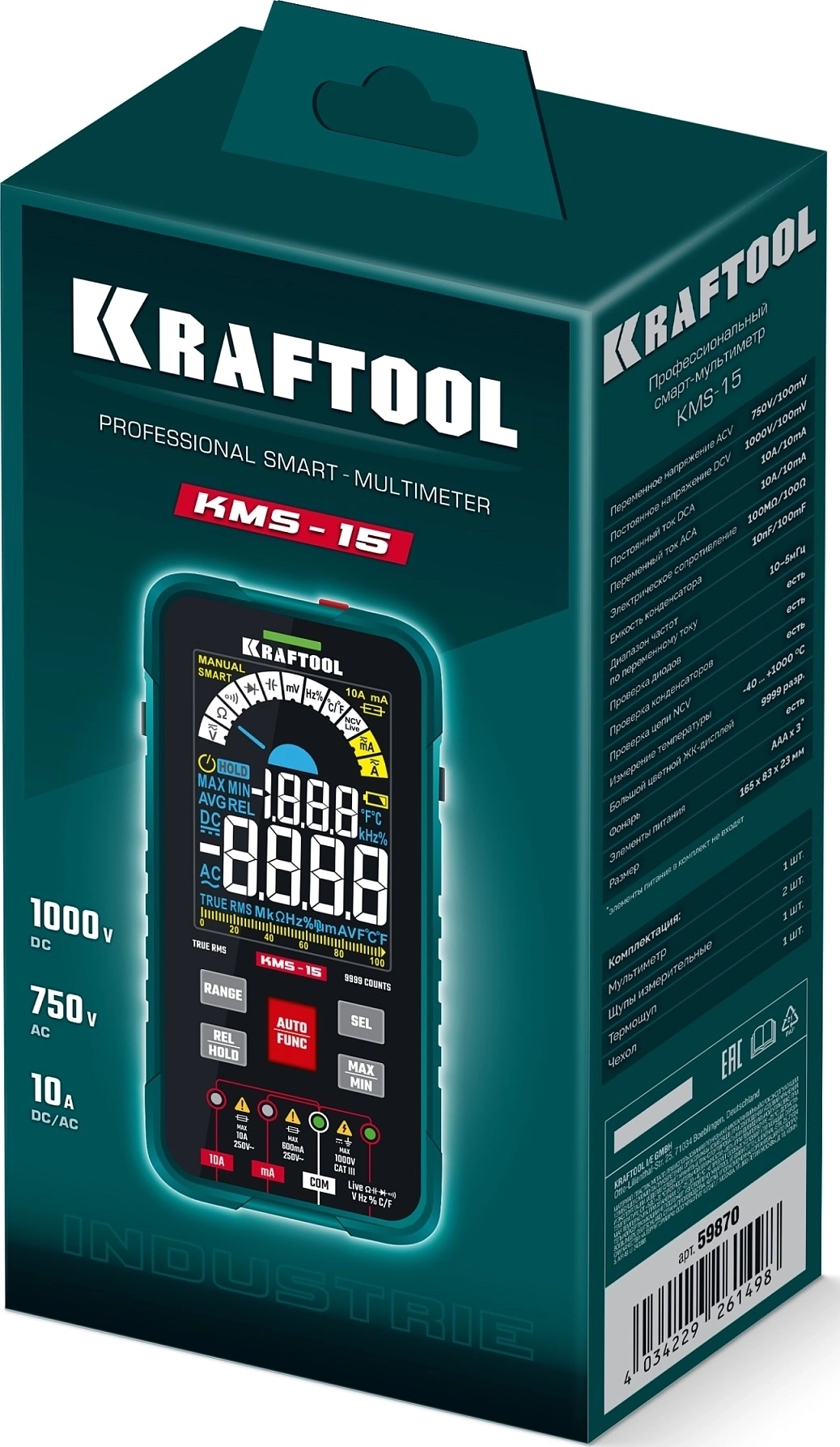 Профессиональный автоматический цифровой смарт-мультиметр KRAFTOOL гарантирует наивысшую точность измерений. Применение высококачественных материалов обеспечивает длительный срок службы. Прибор имеет функции измерения переменного и постоянного напряжения, сопротивления, емкости, проверки целостности цепей со звуковым сигналом, проверки диодов, измерения переменного и постоянного тока, измерение частоты, измерение температуры и режим относительных измерений.