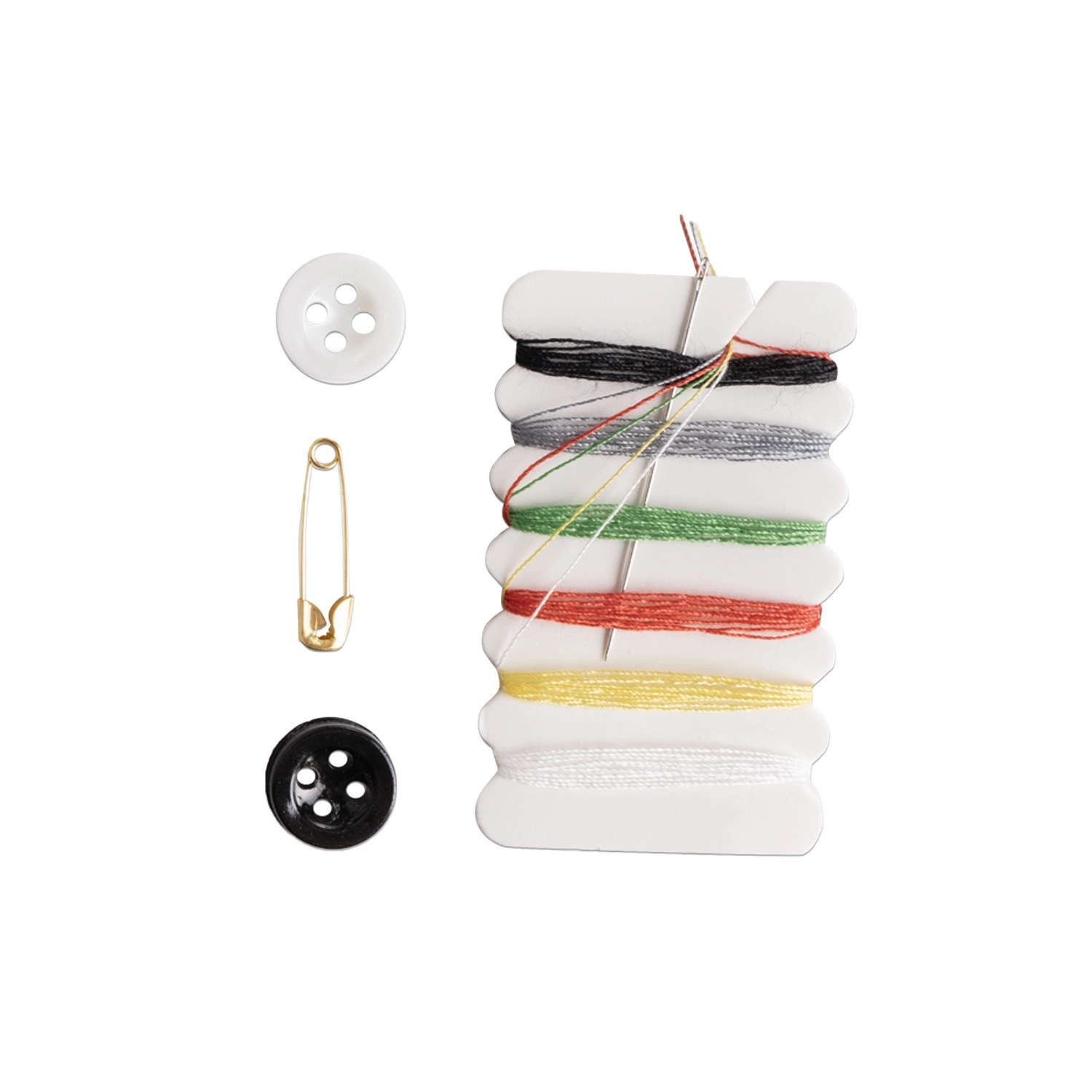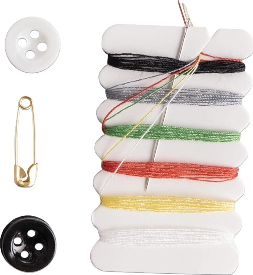 В набор для шитья входит: иголка - 1 шт, нить - 5 цветов, пуговицы 2 шт ч/б, булавка
