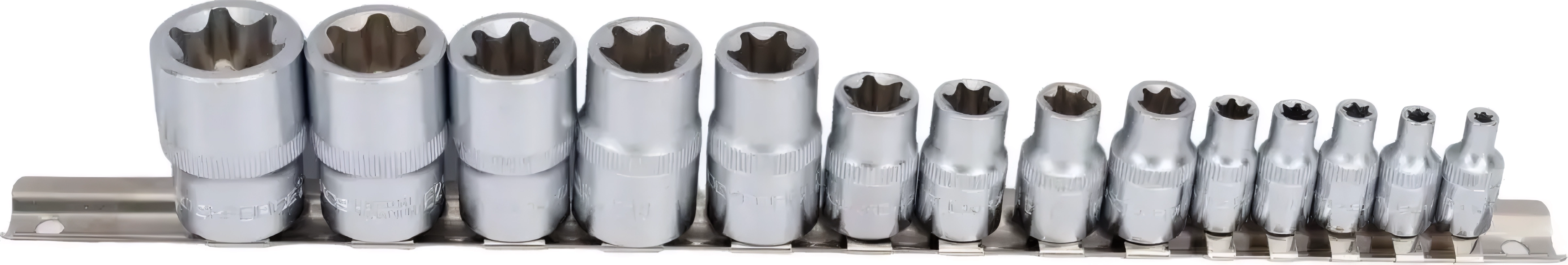 Набор головок Е-профиль 15 предм. 1/4 ,3/8 ,1/2 DR, Е4-24, на держ. ROCKFORCE RF-4158