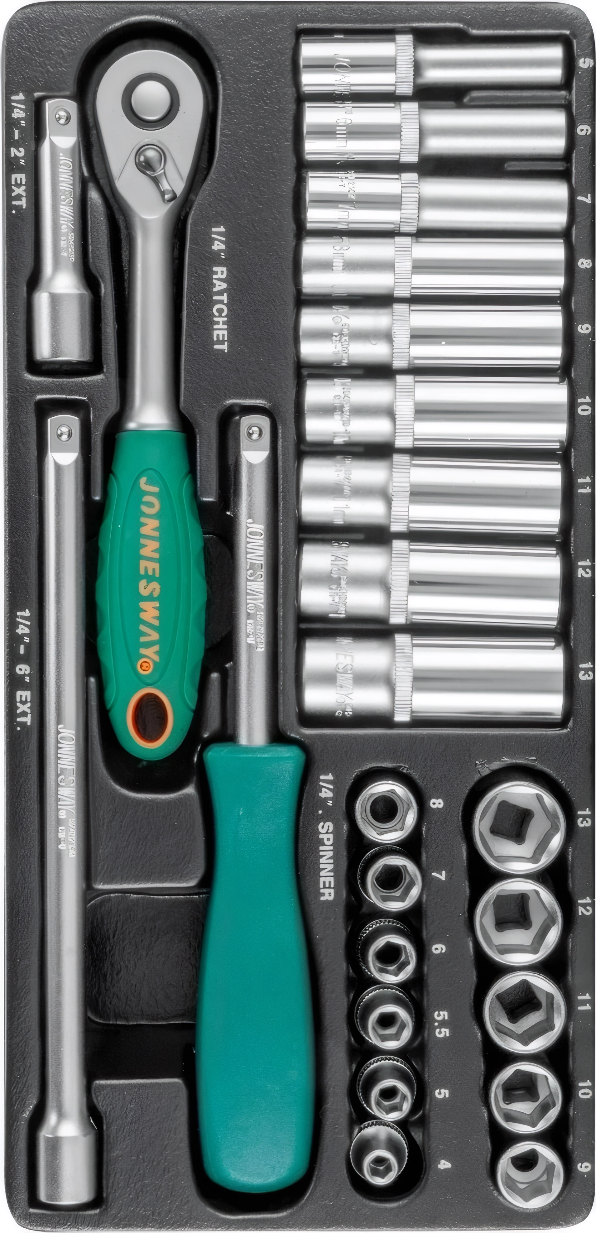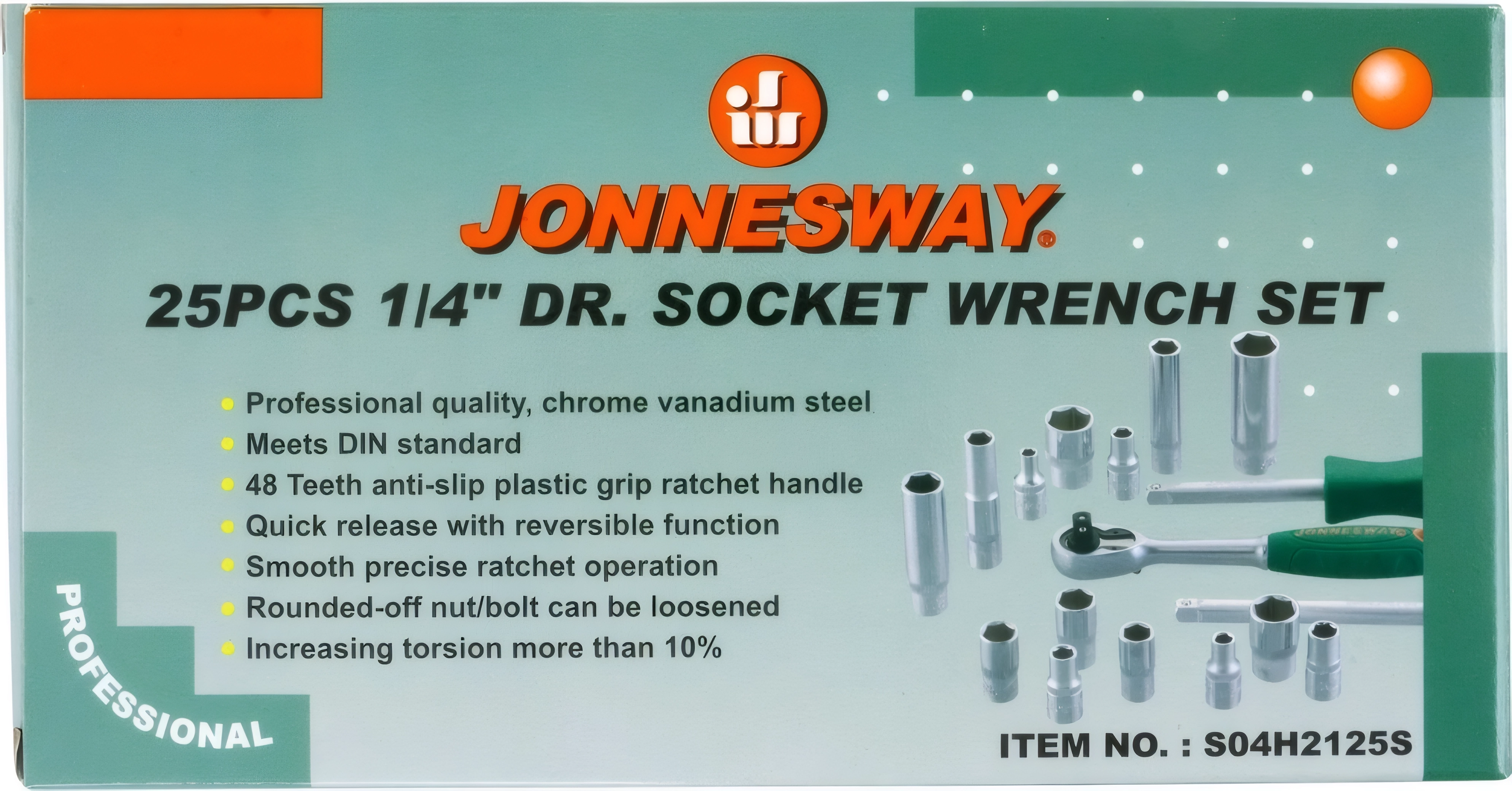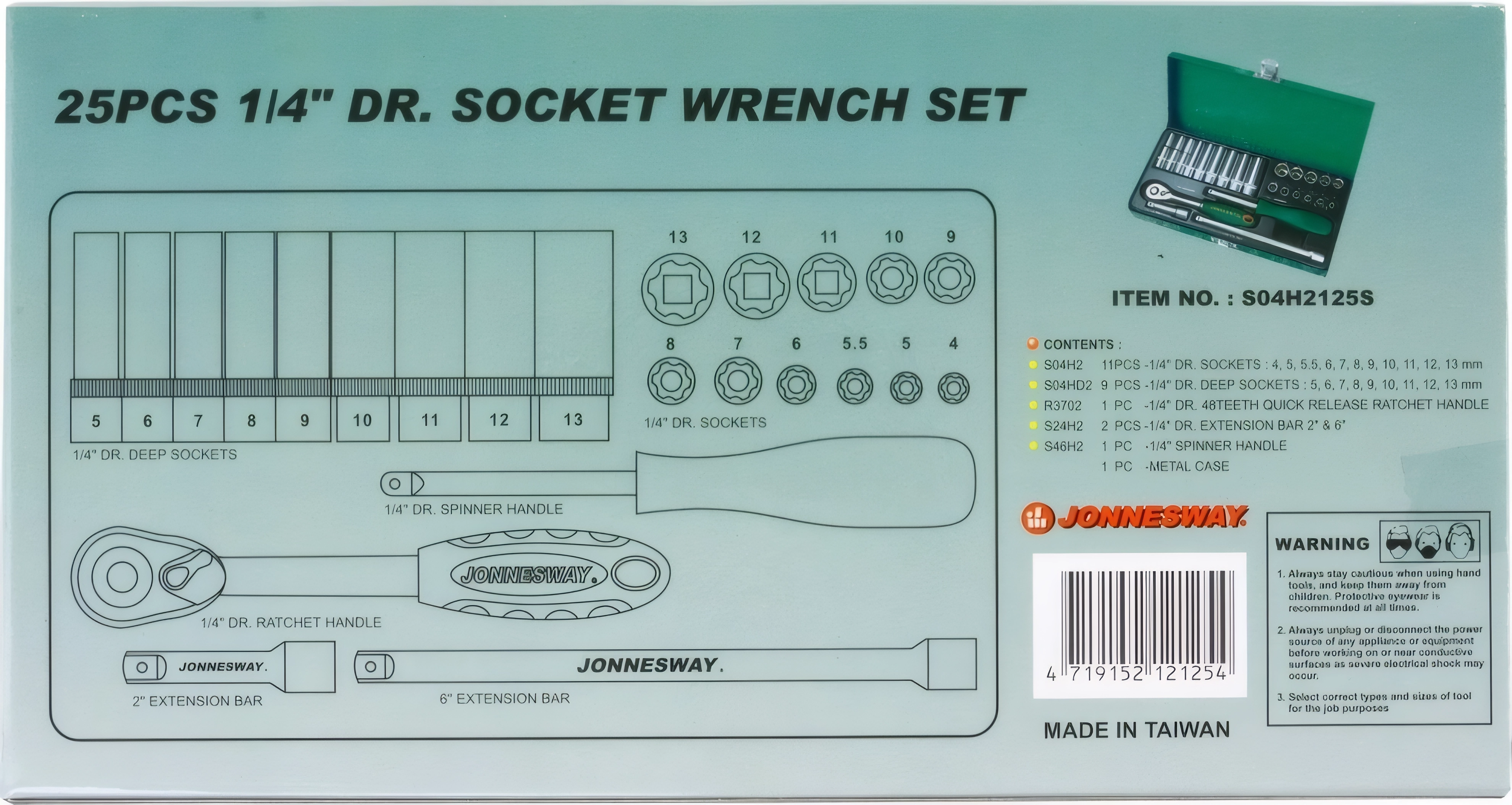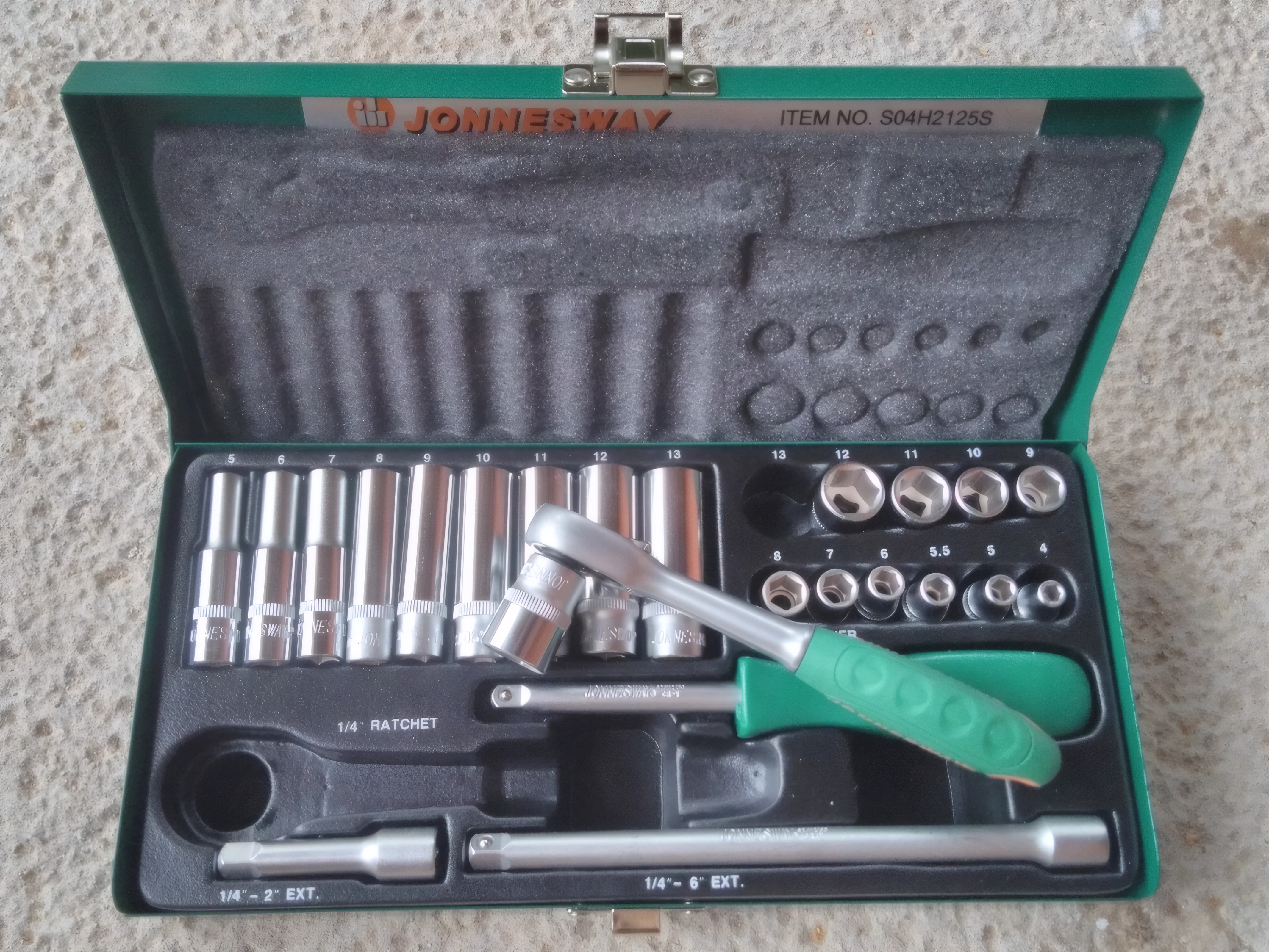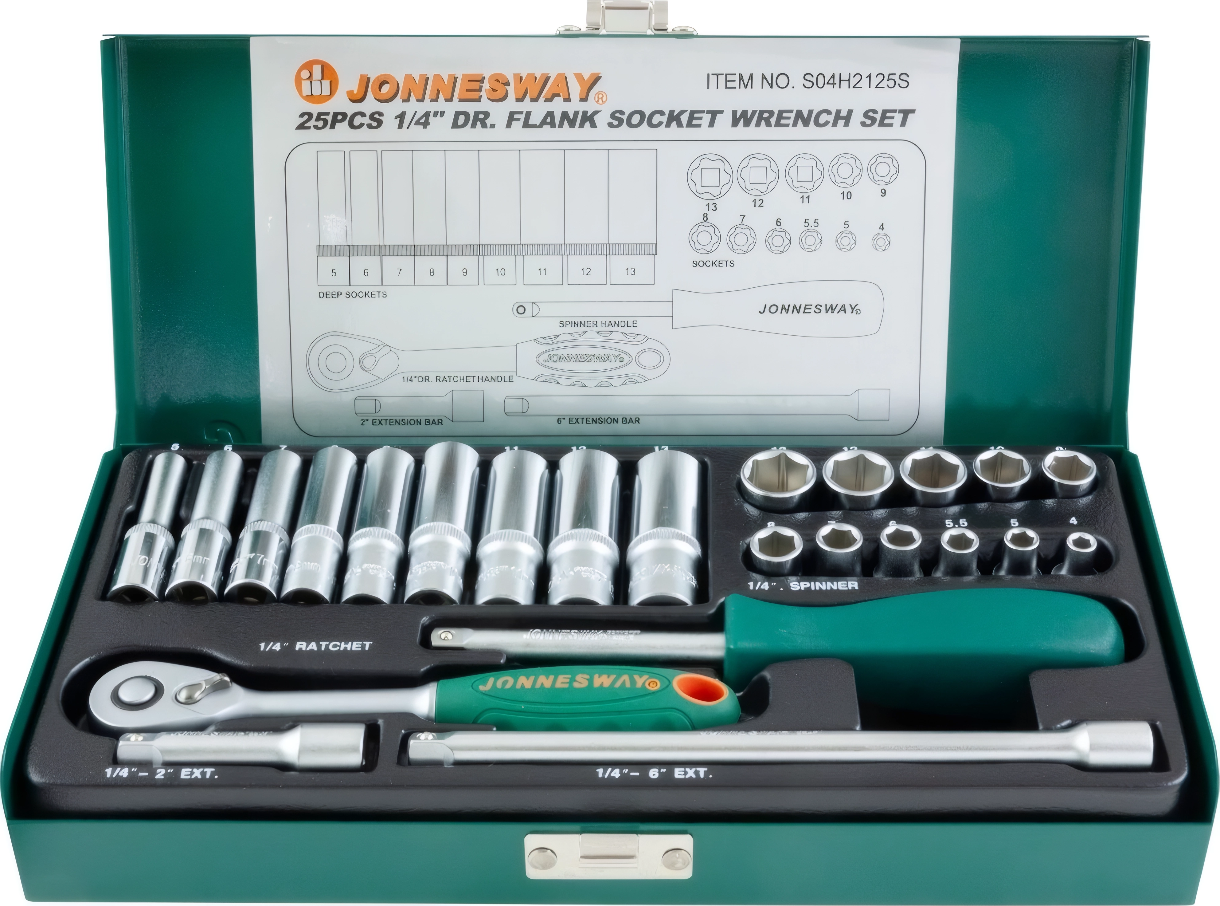 Набор инструментов Jonnesway S04H2125S (47199) - 1/4 дюйма DR, инструменты из хром-ванадиевой стали, металлический кейс, пожизненная гарантия, 2 удлинителя, трещотка и отверточная рукоятка в комплекте